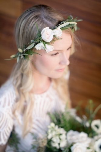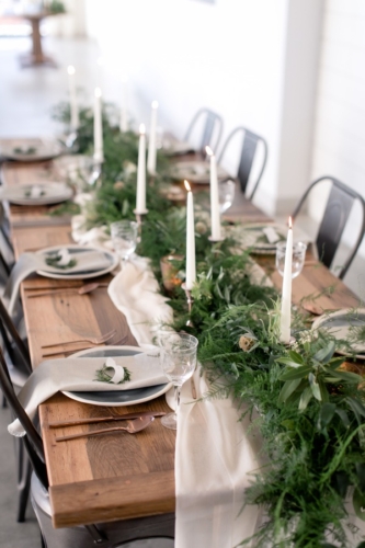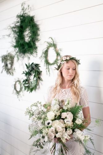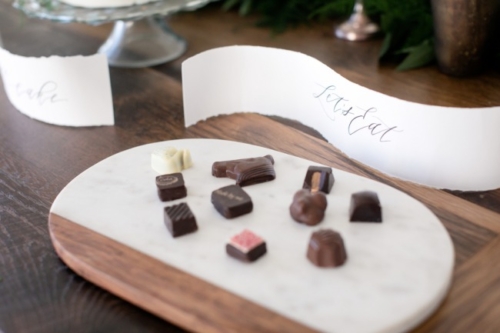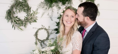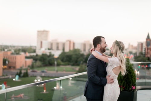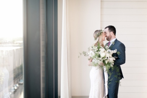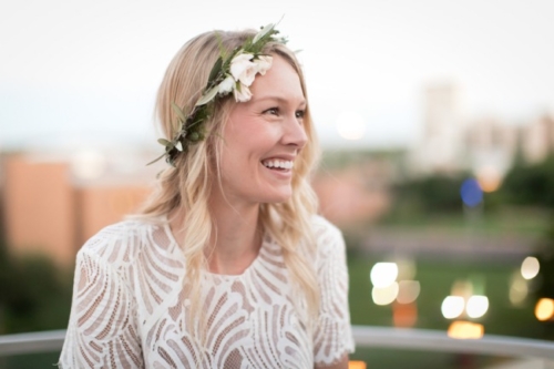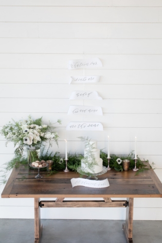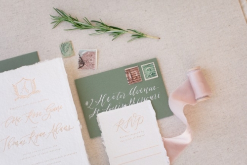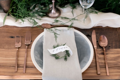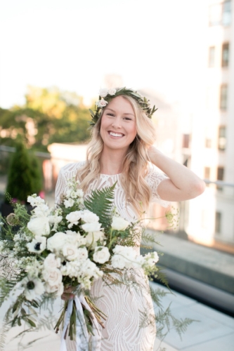 Photographer’s Remarks: “Rachael and Michael, the lovely couple, had their first wedding anniversary the week of this inspiration shoot, which made it extra fun. Rachael wears her own wedding dress, an art deco patterned gown by Watters which she purchased at BHLDN. “We loved collaborating with fantastic local creatives to design an organic, soulful look with bohemian and industrial influences. We were especially inspired by natural textures: the raw edges of handmade paper, woven linen napkins, smooth ceramic plates, natural wood tables, marble trays, shiny rose gold flatware, soft plumosa ferns and the lace of Rachael’s dress. “Anew, the rooftop venue, not only has gorgeous views of Midtown St. Louis, but all profit goes to the local chapter of Big Brothers Big Sisters. “Wildflowers designed the greenery wreaths, lush table runners, birch arbor, bouquet and flower crown. The Lace Cake provided the graceful tiered cake which was decorated by Wildflowers with plumosa fern. The calligraphy, including the romantic invitation suite, handmade scrolls and fabric wrap were made by On Three Designs. The scrolls spell out a quote from Emily Brontë:Whatever our souls are made of, his and mine are the same.“Rachael’s natural look was by Emily Miller Makeup & Hair. The organic-meets-urban design and styling were by Flourish Events. The delicious chocolate truffles were from The Chocolate Line, a shop in Bruges.”