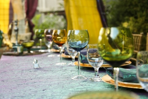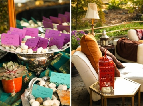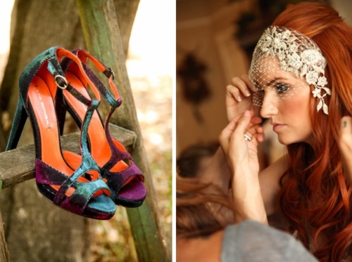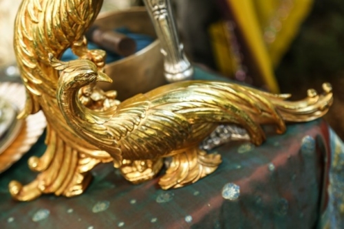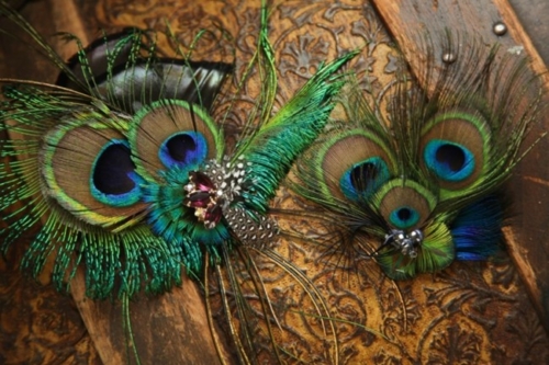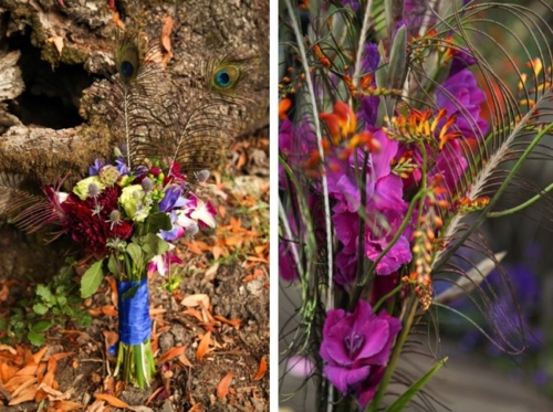 “Rebecca’s parents have peacocks, so the feathers were a theme throughout the wedding décor and color selections. The feathers were even used in her stunning bouquets and boutonnieres. Her reception was decorated with jewel tones, couches to lounge on, and found objects that set the mood for the whole night!”