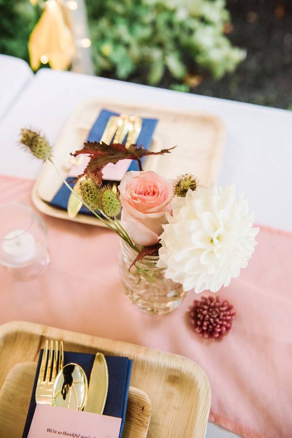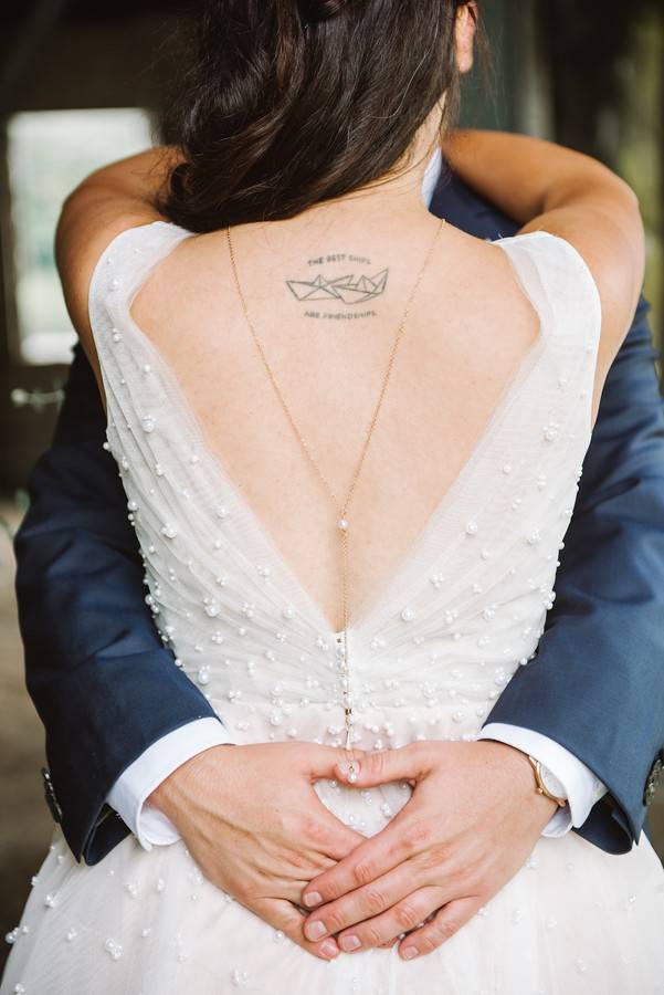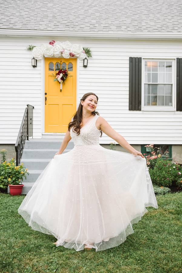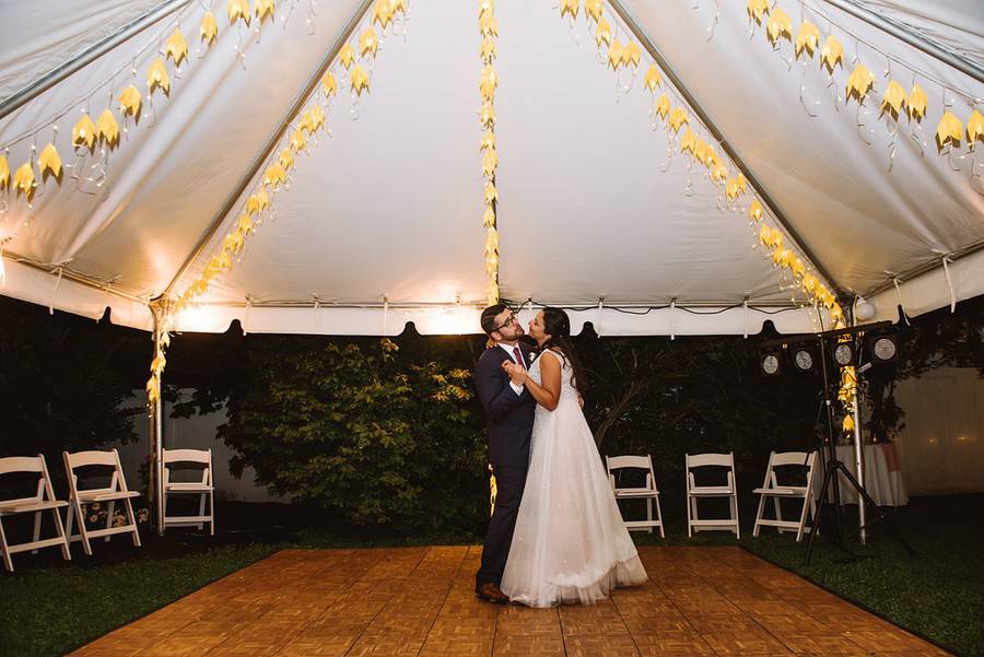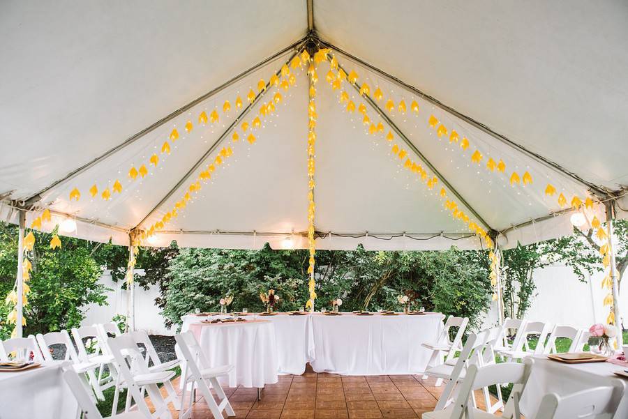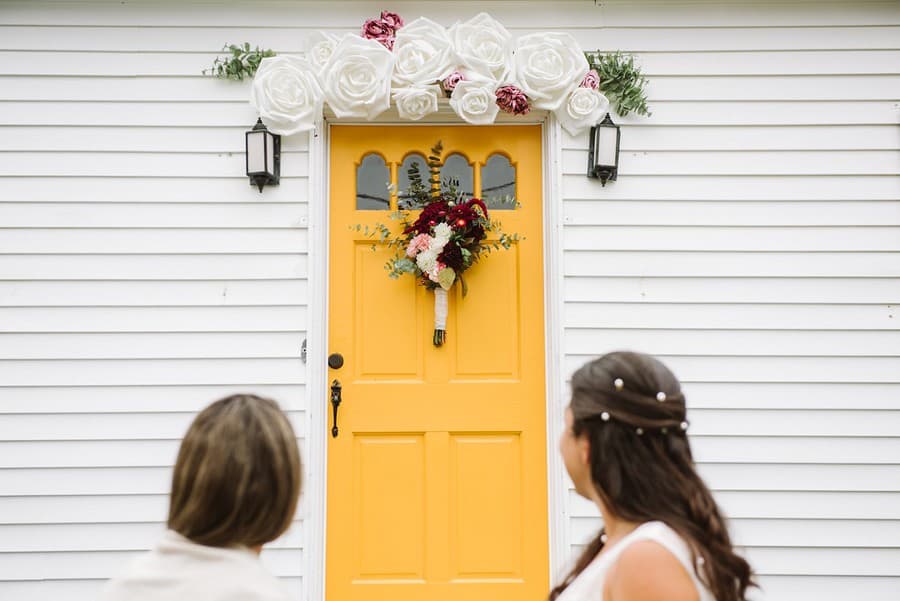 Photographer’s Comments: “The way Nic & Bree met and married each other is quite a full-circle story. They initially had a budding work romance where sparks immediately flew. After rescuing a pup named Kylo (yes — they are huge Star Wars fans!) and buying their first home together, Nic & Bree proclaimed their love in front of their closest friends and family during their amazing housewarming party, which coincidentally was their wedding day. “Continuing to work together as Studio DiBella this power couple planned, designed, and orchestrated all the decorative elements in their wedding. From the invitations, stationery, signage, over a hundred origami cranes, and the custom paper floral garland hung above their front door to their home, to the bouquets, Bree & Nic did it all. “They chose an epic first look location at the Old Stone Church and had a magical ceremony lit by over a hundred yellow origami cranes and fairy lights (that Bree folded herself). The most said phrase during their day was “This wouldn’t have been possible without Bree”; the love she put into the design work for her, her husband, and her guests was evident. To end a lovely day, everybody danced the night away just as the rain finally came to close off the wonderful evening.”Gallery