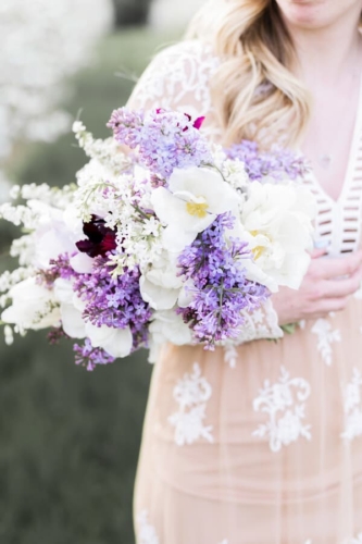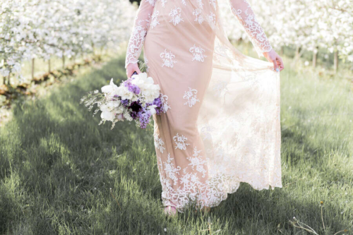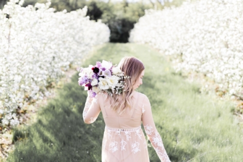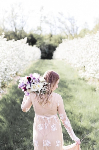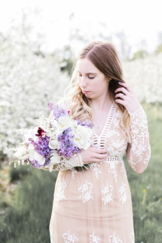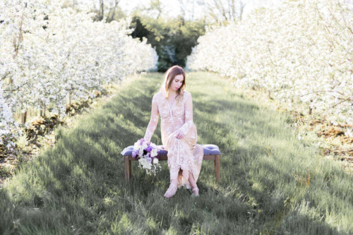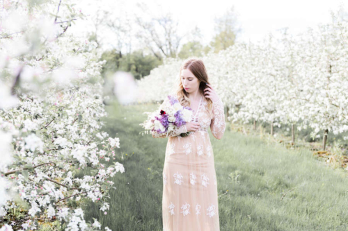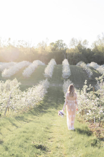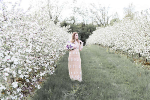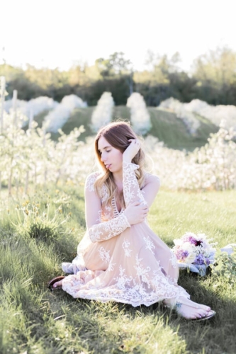 Photographer’s Comments: “Originally, this was to be a couples session, but Justin fell ill and so we turned it into a bridal session with just Katie. We met in a beautiful local apple orchard in Hamilton, just barely in full bloom and perfect in the evening golden light. I love this orchard, as the rolling hills are ridiculously beautiful, especially with the sun setting in the background. “Katie wore a pretty boho gown from Forever 21, which is a perfect alternative to the traditional wedding dress. Accompanied by a lilac bouquet, we started in a fully blossomed row & then moved with the light to the higher areas of the orchard. One of my favourite shoots to date.”Gallery