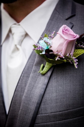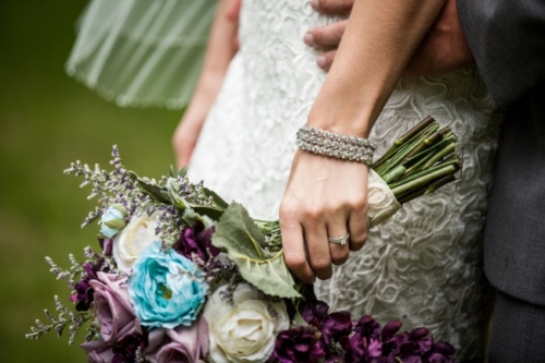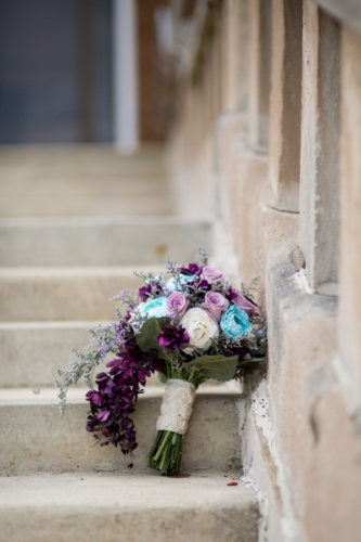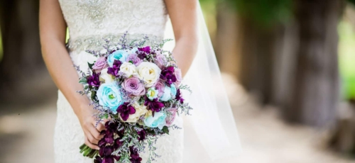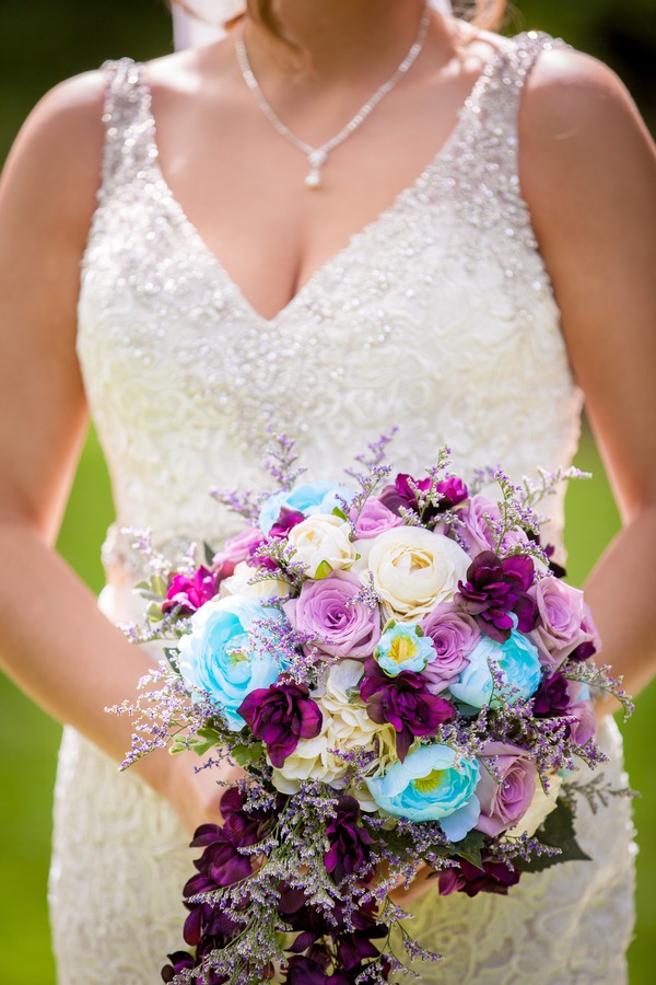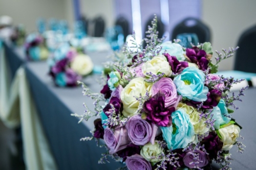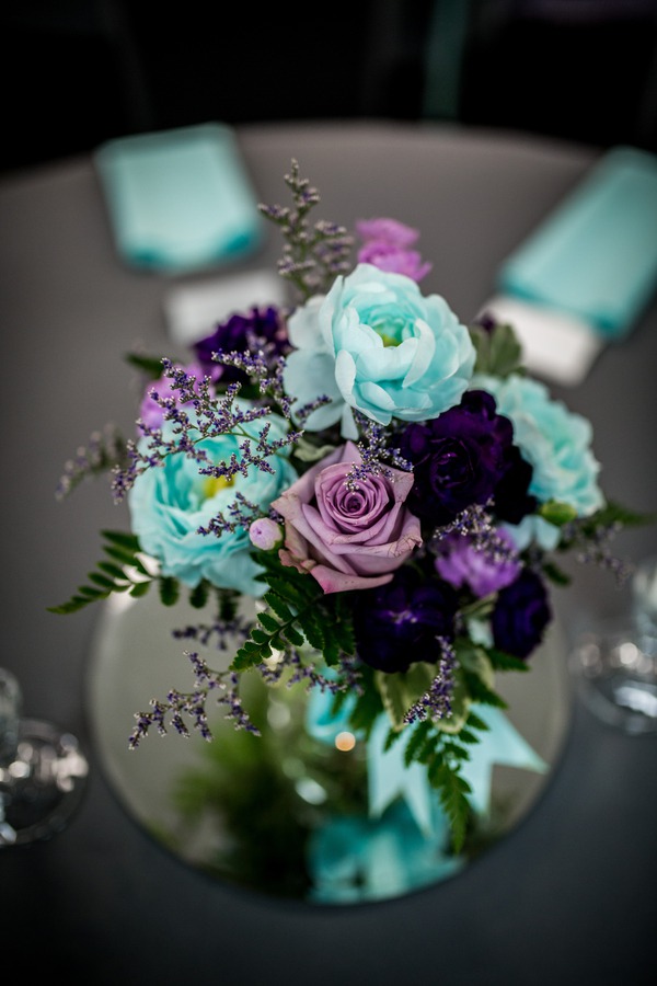 We love the bold color scheme of today’s featured wedding with robin egg blue & shades of violet! Check out the striking bridal bouquet and floral arrangements, together with bridesmaid dresses in robin egg blue and matching colored neckties for the guys.