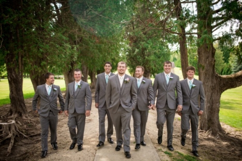 Gorgeous gals in robin egg blue (Tiffany blue) bridesmaid dresses. And, dashing gents in gray suits and neckties!