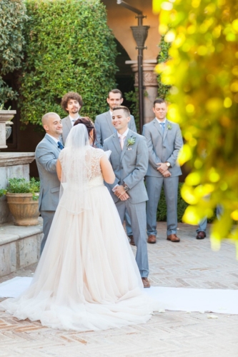 “Brittany approached in the romantic vineyard walls of Villa Siena towards Grant who had his back turned. And when she finally tapped him and he turned around, it was the cutest ‘Ahhh!” moment ever! His hands went straight over his mouth and in amazement at his glowing bride and then he gave her the biggest hug! It was so fun to capture this sweet moment between them!”