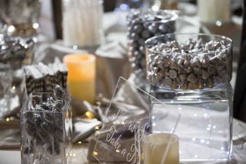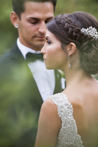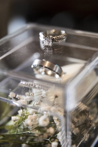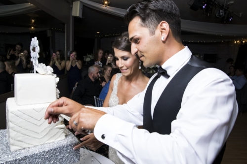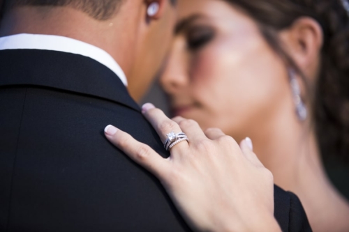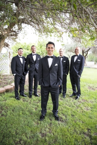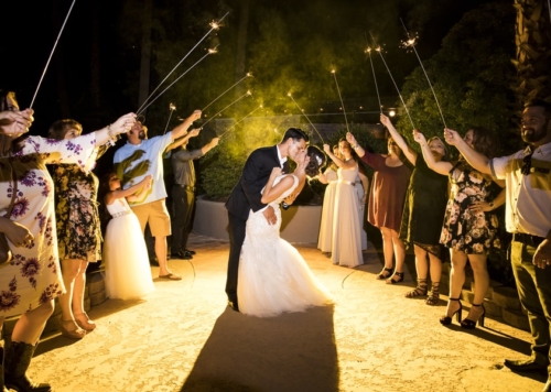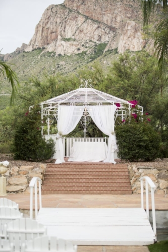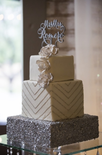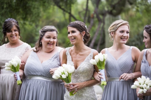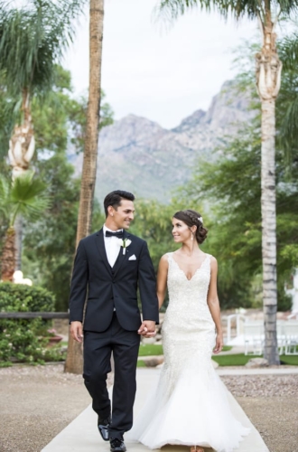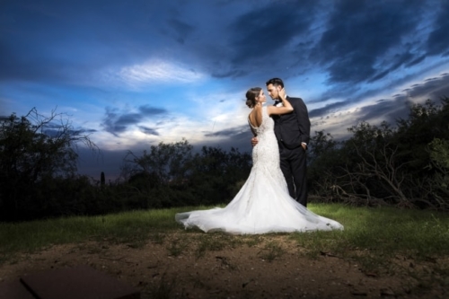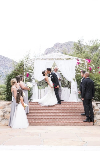 Photographer’s Comments: “We knew that this was going to be a fun wedding when we found out that the bride and half of the guests were coming from South Carolina and that both the bride and groom were BMX racers. “What we were not prepared for was how perfectly the overcast sky lit the mountains and left us with the most exquisite Tucson sunset. Brittany and her girls began the day with hair and make up by Margarita GoDiva and the ceremony and reception site venue, Reflections At the Buttes. “The bride wore a fully beaded Allure gown from Jo-Lins Bridal and Formal wear, located in Columbia, SC. “KJ and his boys wore tuxedos from the Black by Vera Wang line which they got from Men’s Warehouse. “Brittany kept her decor simple and clean with white florals, silver details, and customized acrylic accents and signs everywhere- which I loved! The acrylic was so unique but also fit perfectly with the rest of the decor. The bouquets were simple white tulip bunches from Eric’s Flower Market. “The cake was done by Sweet Creations Studio and the wedding rings were from Brownlee Jewelers in Charlotte, NC.” From the bride: “KJ and I met racing BMX bicycles. He lived in and I lived in Batesburg, SC at the time. After we started talking we found out that we were both checking out the other at a race a few months prior in Louisville, KY. “We talked online for three months before meeting in person at a BMX race in Oldsmar, FL. We officially started dating that week. “KJ moved to SC 9 months later. He’s the sweetest guy I’ve ever met and he spoils me! We’ve been together 4.5 years now. “My favorite Place to vacation is Destin, FL. KJ told me he had planned a nice dinner for us while we were there. He kept the location a surprise. We arrived at the restaurant, Beach Walk Cafe at Henderson Park Inn, and were shown to our table, which was set up on the beach all by itself. We ate the most delicious dinner and had the most beautiful view of the ocean. As if that weren’t a big enough surprise, at the end of the dinner KJ got down on one knee and asked me to marry him. Everything was perfect!”Gallery