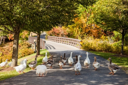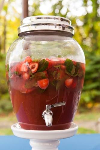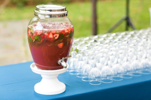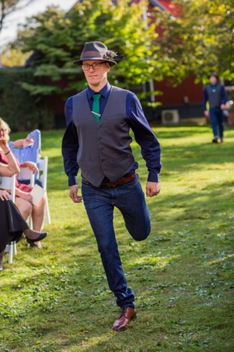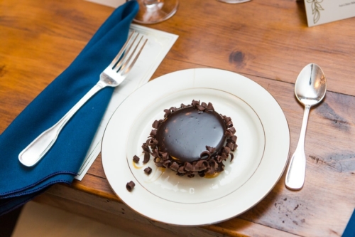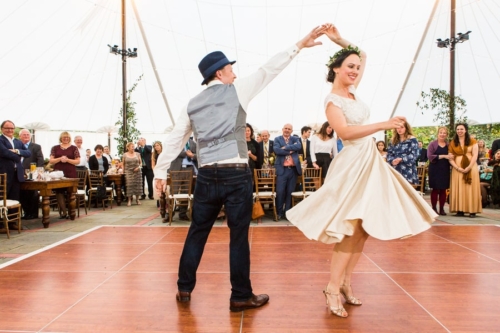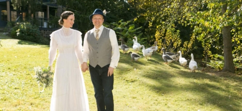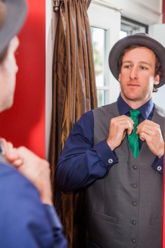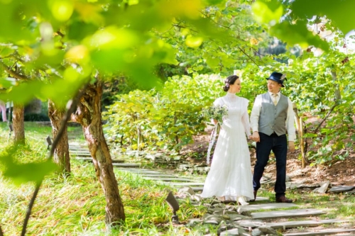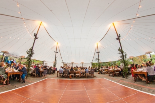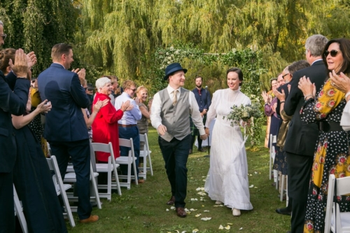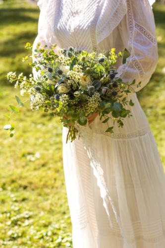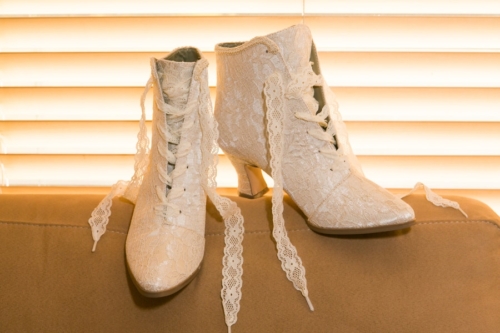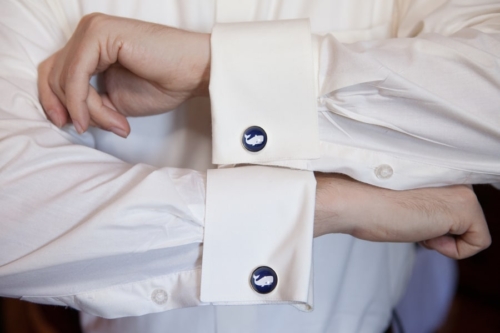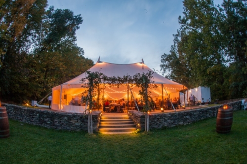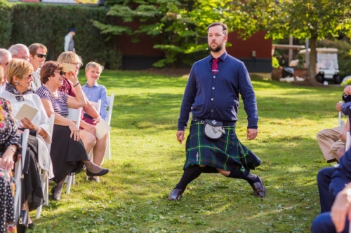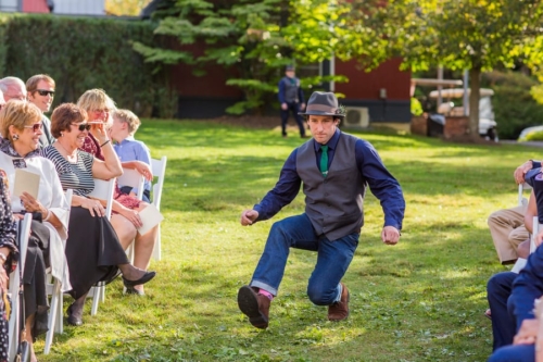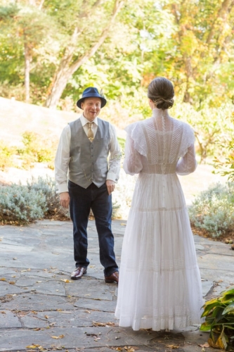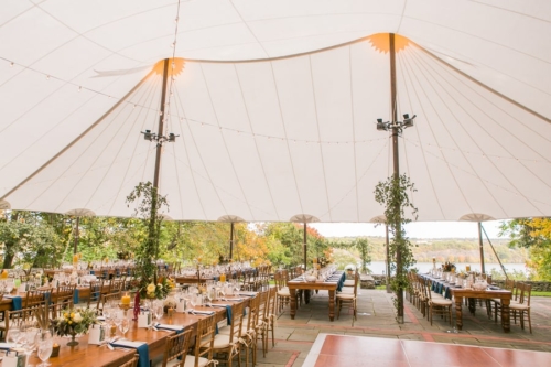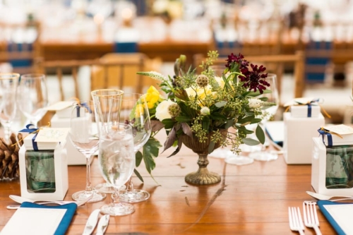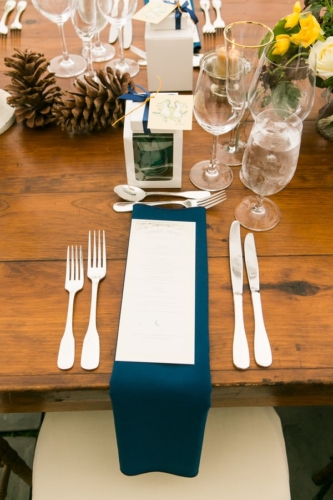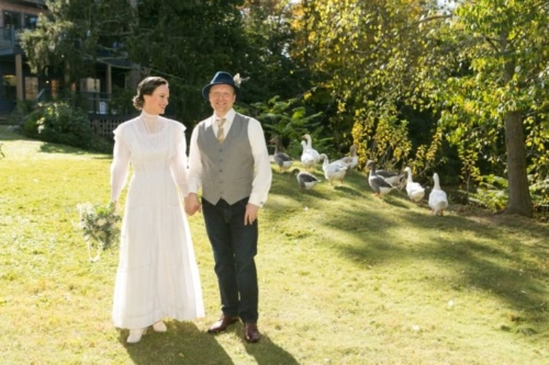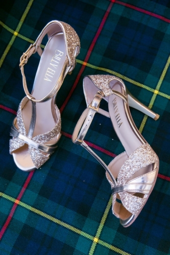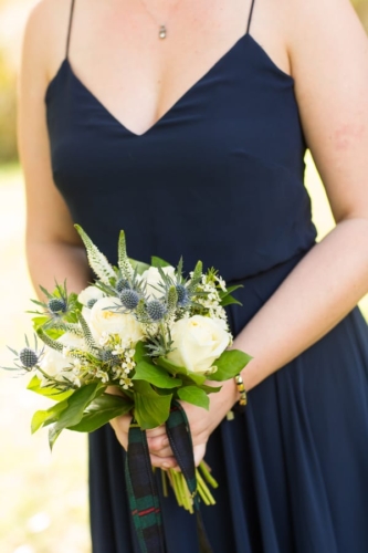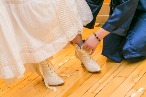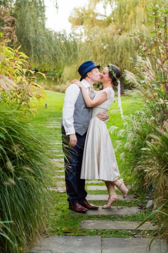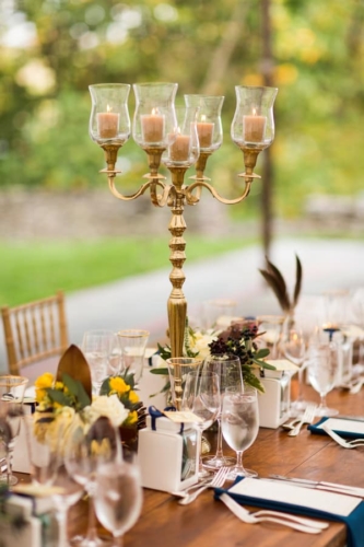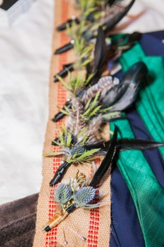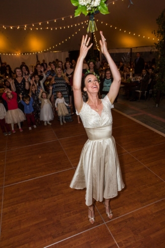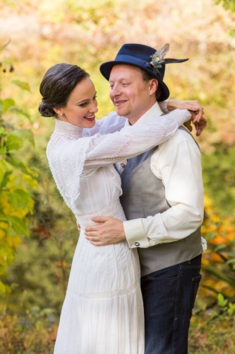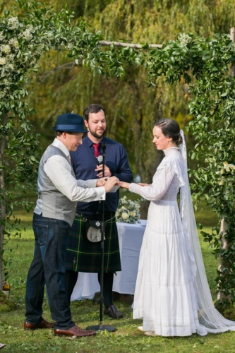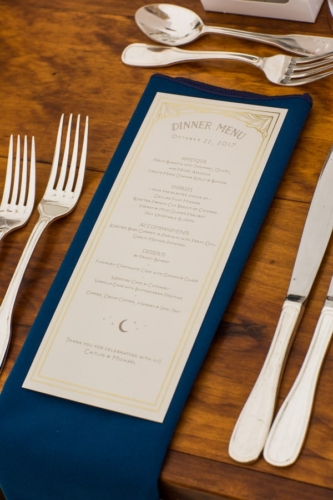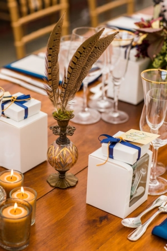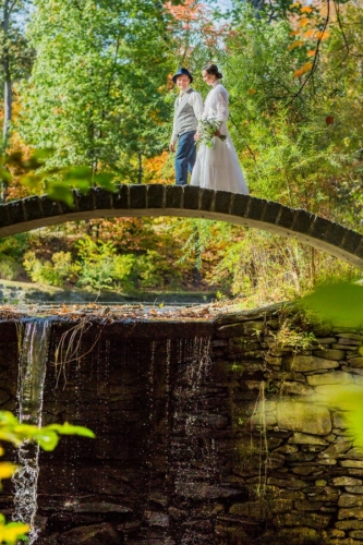 From the couple: “We call our palette Highland Autumn: based on deep blue and emerald green, with accents of gold, burgundy, toasted brown, creamy yellow, and MacEwan tartan representing the bride’s Scottish roots. “The groom’s Italian heritage is expressed by the men’s snappy fedoras. From our motif of playful dancing dragons to the elegant Victorian vessels overflowing with flowers, our aim is to draw together eclectic elements reflecting different aspects of our backgrounds and personalities. “A touch of Jazz Age swoop and sparkle livens up the decor, while wine barrels and farm tables lend rustic warmth. The unifying themes are a retro sensibility and rich fall colors.” From the photographer: “Caitlin & Mike were married on a beautiful weekend in October at the fabulous farm-to-table venue Buttermilk Falls Inn up in the Hudson Valley, just a short drive from NYC. I was so so excited to see what they had in store for us as I knew from talking with them about their plans that this wedding would be super unique and full of fun surprises. “I started the day with Caitlin’s getting ready with her bridesmaids in one of the Inn’s sweet houses. Her wedding dress was, amazingly, an antique lace gown that her mother had bought for her as a young teenager because it was such a perfect fit on her long torso. “She had planned to wear it at her wedding ever since, and seeing that it (incredibly!) still fits her, she did just that! The vintage look informed much of the wedding, and Mike and his groomsmen sported hats for the occasion, and festooned them with flowers and feathers. “Caitlin’s brother officiated the ceremony and took the opportunity to wear a formal kilt, which looked great, and he got everyone laughing– this guy could go pro! “Speaking of their ceremony, I was tickled to see the men take their processional to the next level by performing silly walks down the aisle, something that was inspired by Monty Python. “After exchanging personal vows they wrote themselves, Caitlin and Mike exchanged a pair of very unique rings and sealed their union with a kiss. “Guests were led across the beautiful grounds to a tented cocktail hour featuring the most impressive cheese collection I’ve seen at a wedding. Cheese, chocolate and wine are a passion this couple wanted to share with everyone at their wedding, so dessert was an incredible chocolate creation instead of the standard cake-slice, and I can only imagine the wine served was impeccably paired with dinner! “Highlights of the evening included an epic spontaneous dance off featuring our kilted officiant, Caitlin’s mom’s toast, which started with a bit of brilliant prop humor, and a dance floor full of the most adorable families with small children ever. “I had so much fun capturing this tremendous wedding! Congratulations to Caitlin & Mike!”Gallery
