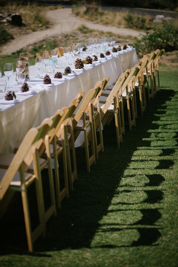 There are so many details I love about the wedding! Not only the pinecones, but her dress is stunning. The use of scenery for natural decor with the way the tables are set up, the his and hers arrows, and the activities listed on each table. So many fantastic ideas in use here.