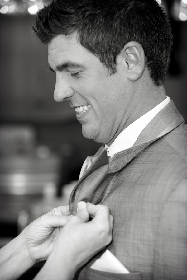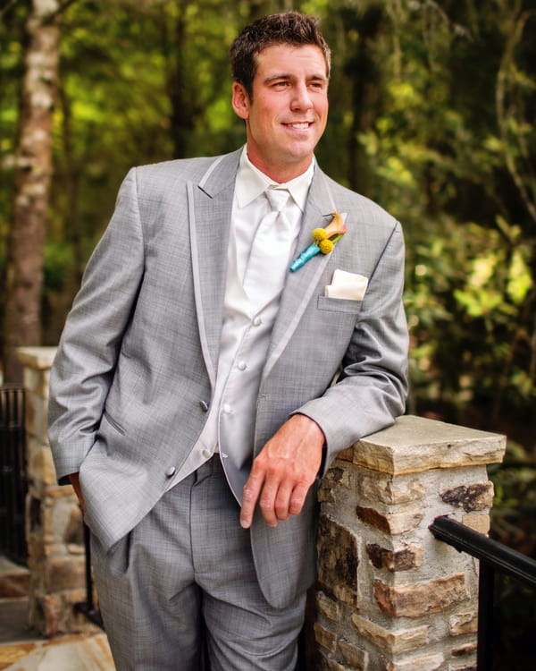 The Groom bought his grey Calvin Klein tuxedo from men’s warehouse. He paired it with a tie and vest and wore black shoes.