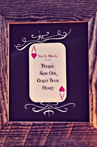 Here is what Tamiz Photography had to say: “When Carol shared with me her vision of her wedding, she said she wanted it to be ‘sweet like candy’ and it sure was. The wedding decor was inspired by a vintage Alice in Wonderland tea-party, which made it really fun and playful. Stacked vintage books and flower filled tea-pots made up the centerpiece decor along with tiered teacups and saucers. The wedding stationary, made up of playing cards was very reminiscent of the Queen of Hearts. ‘Drink Me’ tags adorned cocktail straws and ‘Eat Me’ tags attached to mini candy favors brought everyone back to the well loved story and adventures of Alice in Wonderland.”
