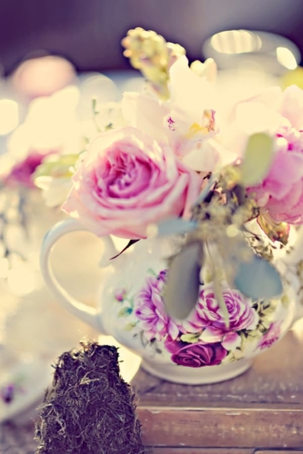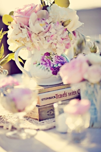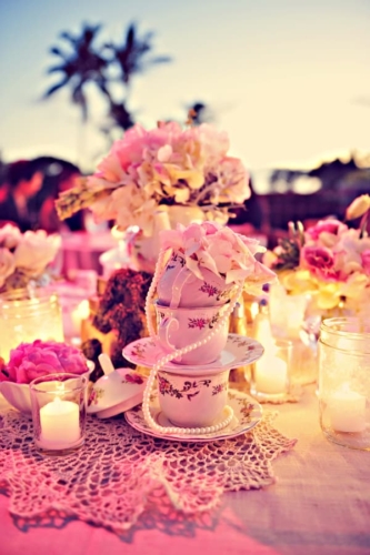 Anyone for a game of croquet? This mad hatter tea party table is elegant and refined, with a playful feel that really ties the theme together. Matching flowers to the teacup and teapots complete the look.