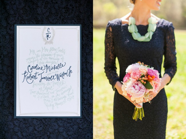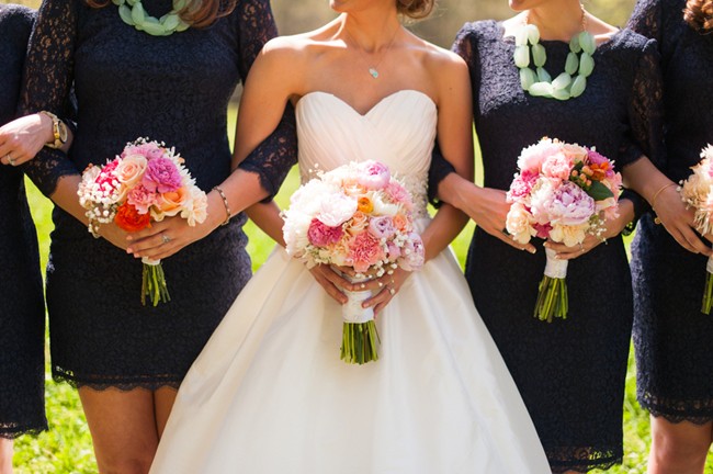 “The bridesmaids wore navy lace dresses. I loved the dresses because of the scalloped detail along the edges, and I thought the sleeves would be nice in case it was a cooler day. Thankfully, we had a beautiful spring day! I wore a Tiffany necklace from my parents during the ceremony and switched to a monogram necklace for the reception.”