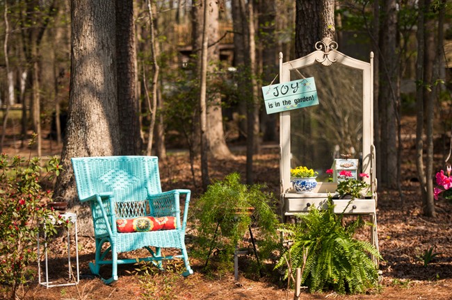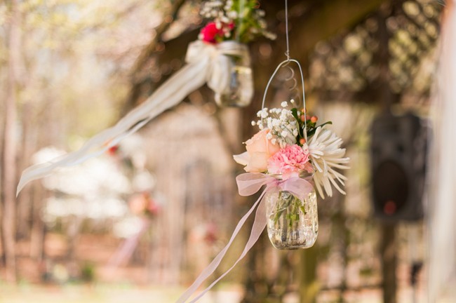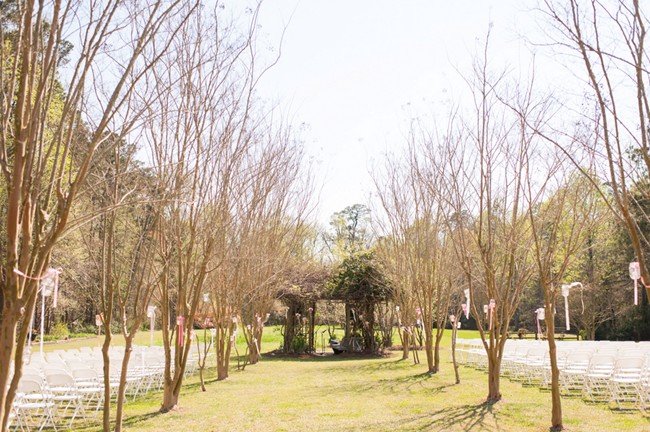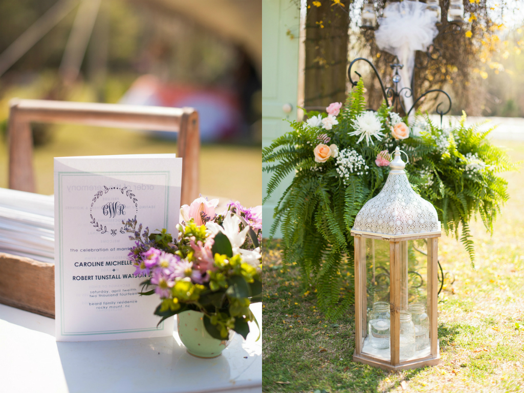 “The wedding took place in a beautiful backyard, owned by one of the most thoughtful couple we know. When you walk through the tree line, it opens up to the backyard with a pond and aisle lined with crepe myrtles. We decided to go for a romantic garden feel and added lots of flowers and ribbons for the ceremony and candles and lanterns for when the sun set.”