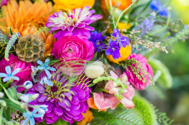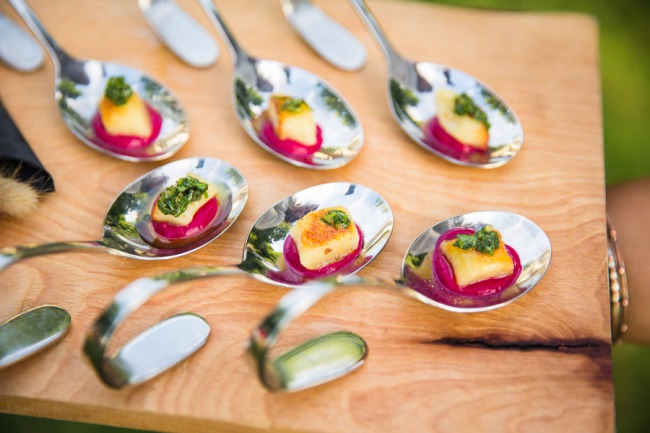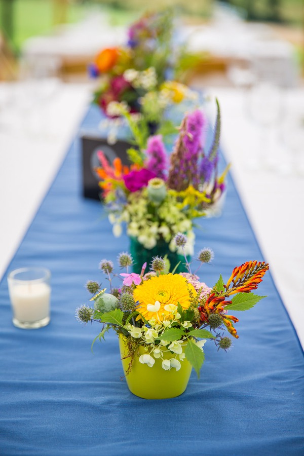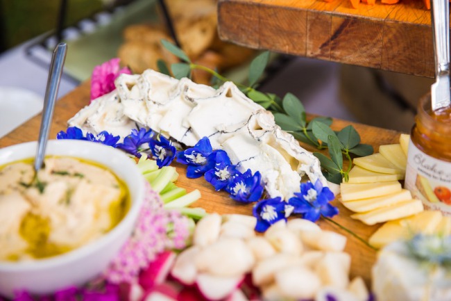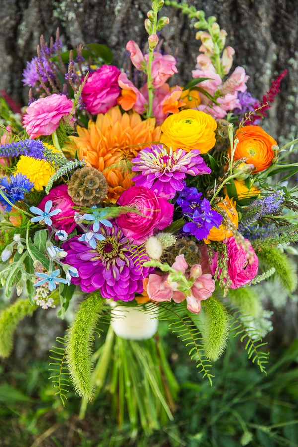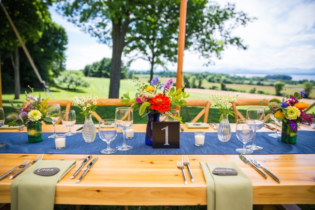 Photographer’s Comments: “Carolyn and Fergal’s wedding breaks the mold when it comes to a wedding’s color palette: it covers the whole spectrum! A rainbow of flowers of all shapes and sizes fill cute colorful jars on the farm tables that are set with cornflower blue table runners. “The delicious farm to table food got in on the game with a beautifully arranged cheese board filled with jams, Vermont cheeses, and more flowers, with pops of magenta beet puree under handmade ricotta gnocchi for an appetizer. Individual strawberry shortcakes and fruit tarts made for a perfect summertime dessert in July. “As guests in Adirondack chairs watched, even the weather participated with a gorgeous sunset cascading a pink-orange glow over the valley of green fields, finally settling below Lake Champlain’s horizon. “Other details you don’t want to miss is Carolyn’s bouquet, her vintage wedding ring, and the kid’s station filled with bubbles, pipe cleaners, colored pencils, and paper, which turned out to be the cutest way for Carolyn and Fergal to receive their very first wedding present.”About This Wedding