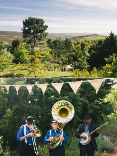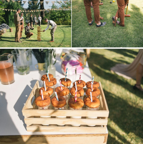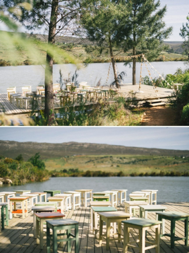 We are ending the week with a really long wedding—it is way to amazing to leave any details out! Carin and Casper live in London where they run Shotopop, but decided to get married in Cape Town, Africa. The location of the their wedding weekend was at the Old Mac Daddy Luxury Trailer Park which is so unique and fun looking–perfect for them and their 40 guests! Their wedding weekend was all captured by the fabulous Welovepictures! The weekend started off with a BBQ and a movie–My Fair Lady! It looks like such a cozy, inviting scene with popcorn, cotton candy and loads of pillows and blankets! Carin’s dress is incredible—we are blown away with how great it looks! Guests were treated with a pre-ceremony cocktail hour on the lawn. With games and yummy food (chocolate milk and donuts). Carin and Casper joined in on the fun as well! Everyone headed down to the dock for a sunset ceremony that looks truly breath-taking! To get the reception started guests were treated Jack & Gin—a drink the couple came up with that is served in tea cups. The recipe for The Jack & Gin is as follows: –   3 parts Hendricks Gin –    3 parts Vanilla infused Jack Daniels (the day before, add a split vanilla pod into the bottle of JD. It imparts a delicious vanilla hint) –    2 parts iced Chai tea –    1 part simple syrup (400ml water to 800g plain white sugar) –    a generous squeeze of lime –    a good sprinkling of cinnamon Mix these all together, then add to teapot with dry ice just before serving. Serve in teacups. Each teacup should have a slice of cucumber, a cinnamon stick (or piece of) and 2-3 blocks of ice. Their wedding had no formal structure—no dinner hour or anything like that. Guest could just mingle and eat when they felt like it. For dinner there was not only yummy burgers and fish and chips, but also make-it-yourself pizza!Gallery