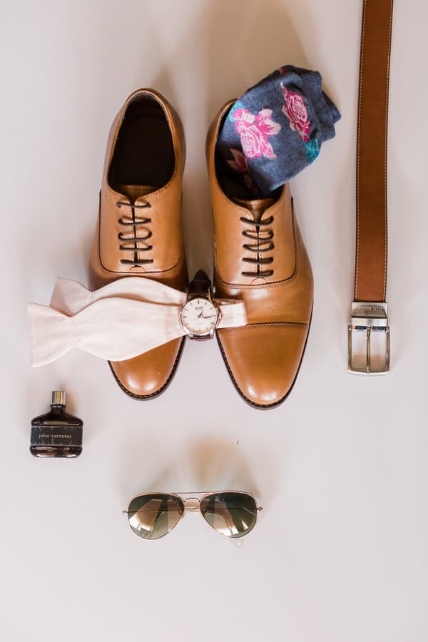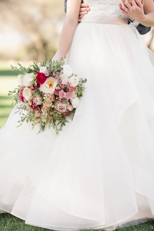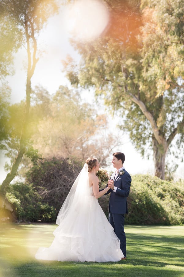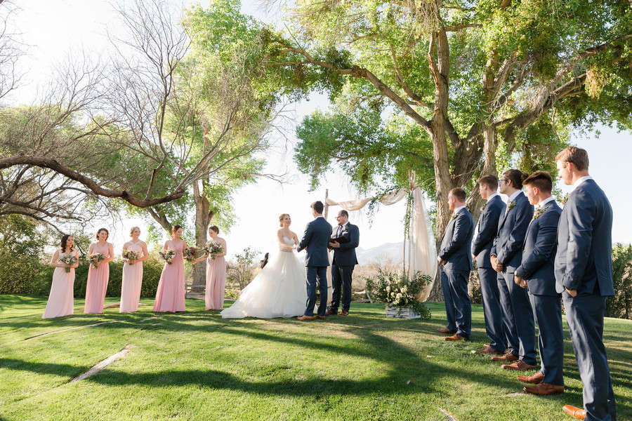 Photographer’s Comments: “Christa and Robby celebrated their outdoor wedding at the beautiful La Mariposa wedding venue in Tucson, Arizona–the warm days and cool nights really make spring in the desert one of the best times to get married!! It was a relaxed, easy-going day starting with a warm embrace at Christa’s first look with her dad and then a rush of emotions during her first look with Robby. We were able to spend most of the day taking pictures of the two of them, their family, and friends before heading to the ceremony. First looks don’t take away from the moment you are walking down the aisle, as is evident by the joy on Christa’s face and the welling of anticipation from Robby. I like to say that you get two special moments of seeing each other for the “first” time instead of one because you will never be able to anticipate how you will feel when it’s actually time to get married! Plus you get to spend all day hanging out with your best friend!!!“Seeing someone’s planning and color story come to fruition on the wedding day is something I very much look forward to each wedding I photograph. Christa and Robby chose blush, dusty rose, ivory, and navy blue as their color theme with lots of greenery and champagne gold. I adored her mismatched, flowy chiffon bridesmaid dresses with varying shades of pink. Their florals were natural and organic, yet full of vibrancy. She also wore her mother’s pearl necklace and grandmother’s bracelet!“Christa and Robby’s day was absolutely perfect…the details were beautiful and the moments were special as they were surrounded by their loving families and friends celebrating the start of their lives together. You can feel the laughter going through their images and see how much they love to dance, as they ended the night with a sparkler tunnel followed by a spontaneous dance as their guests circled in around them. It was truly a joy to be a part of such a special day!”Gallery