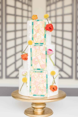 Some of my favorite details of the day include the bold statement table settings and linens, the jaw dropping gold suit, and the whimsical addition of the bamboo bicycle. The beautifully hand painted details on both the cake and stationery elevated everything and helped bring the style the next level.
