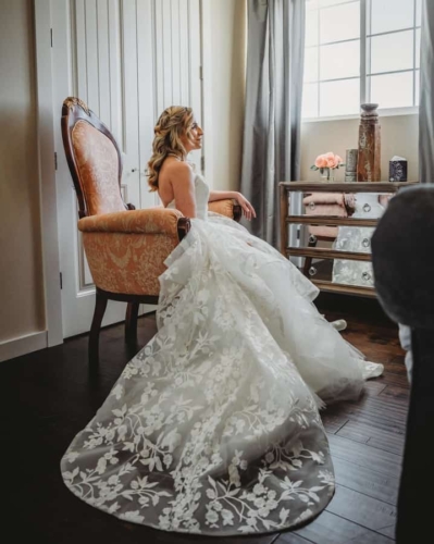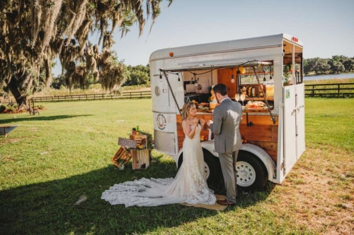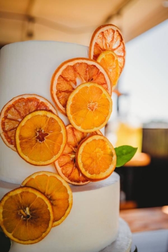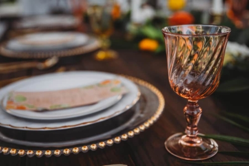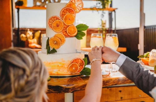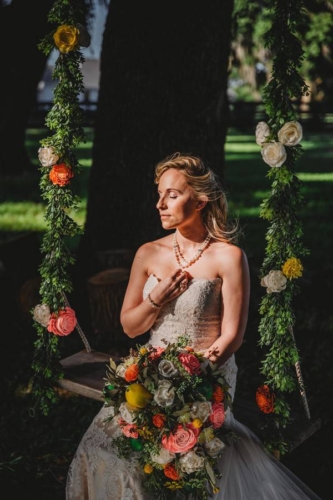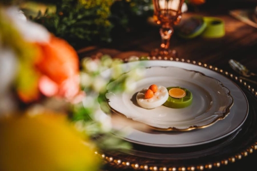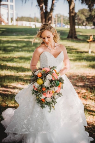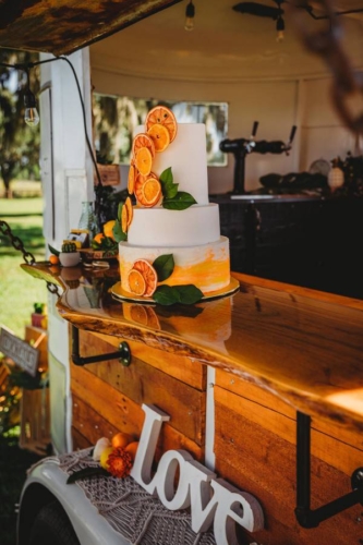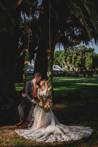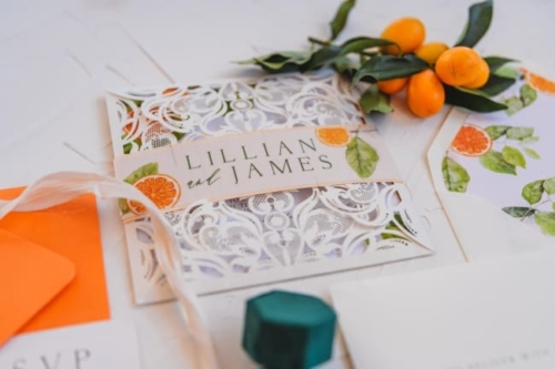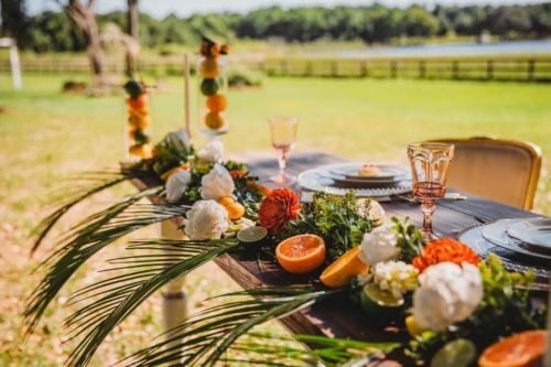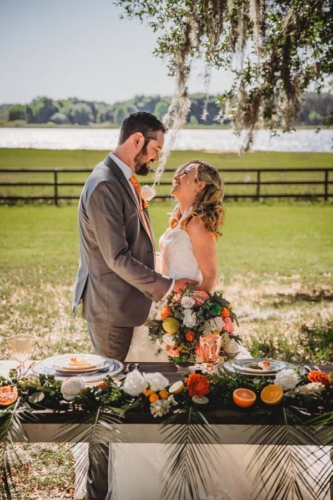 Photographer’s Remarks: “Our goal with this styled shoot was to fill it with all the colors and true feel of Florida. When we thought of which colors feel the most like Florida, we immediately thought of oranges, limes, kumquats, and grapefruits. We wanted bright, fun colors to show off that citrusy feel. “The bride’s makeup was a soft dewey look with a touch of color. We incorporated two wedding dresses and made sure that the groom showed off that citrus color in his cuff links and tie with a handsome grey suit. “The flowers were faux and wood for all the set ups – made by hand by the florist! “The touch of gold on the plates brought out even more color and Florida feel as well.”Gallery