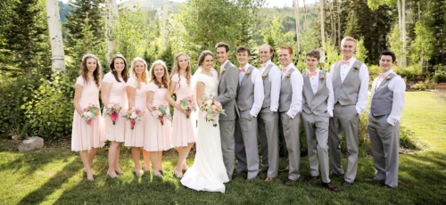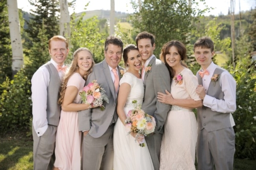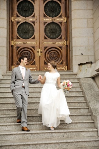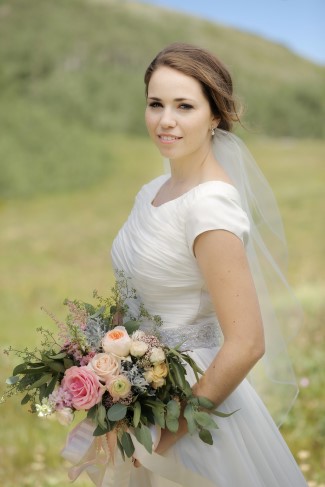 The Proposal “We hiked up the side of Grandeur Peak, where he had laid candles along the trail leading to a bench with flowers and more candles. There was a 180 degree view of the valley and we danced under the stars to the song “Thinking out Loud”. After that, Sean got down on one knee and asked me to marry him. I cried a great deal that night.” Wedding Inspiration “I wanted light colors for summer, and these colors turned out to be the summer hit. Sean and I both love the mountains, so we wanted a mountain wedding. Sadly, the weather was very wet and we had a crazy thunder storm.” Favorite Memory from the Wedding “Nothing can beat the temple sealing. However I loved seeing our little nephew walk the rings down the aisle.” Old, New, Borrowed & Blue “The dress was new, my garter was borrowed and blue, and old were my earrings.”