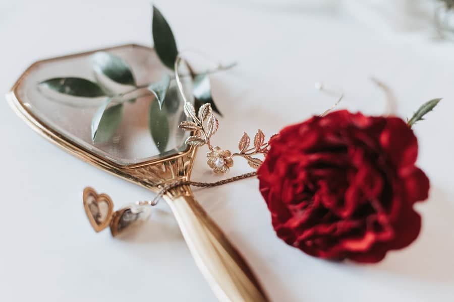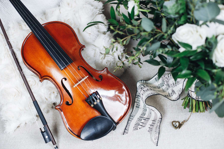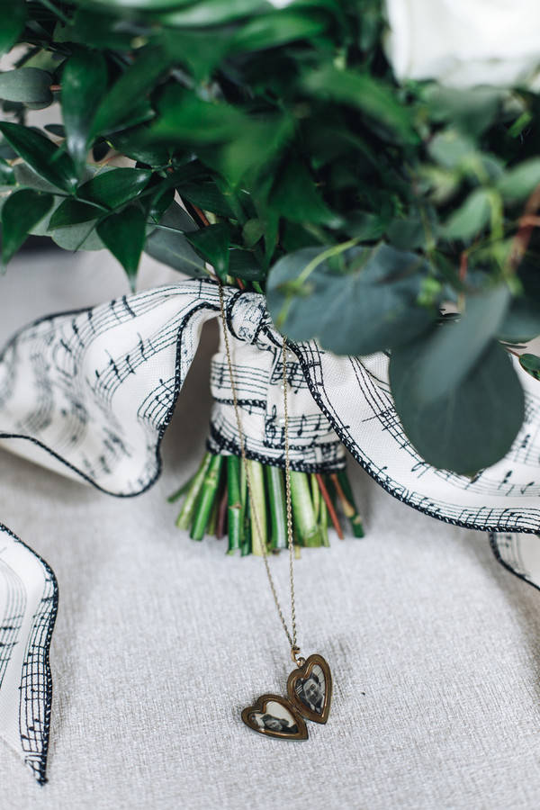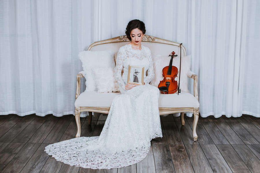 Vendor Remarks: “A beautiful bride looks longingly at the photos she holds in her locket, the photos of her grandparents who couldn’t be there to celebrate this momentous occasion. She reflects back on her family, a musical lineage of great artists, with poise, love, and passion. As an homage, she incorporates the musical heritage of generations into the setting for her wedding day. When old world classical music meets a modern day bride, adding in a simple and refined setting with vintage elements results in a stunning feast for the eyes. “This styled shoot aimed to combine the two worlds of vintage and modern romance mixed with little nods to classical music. Created by wedding planner and board-certified couples’ music therapist Carina Inganamort, of The Wedding Therapist, the vision was only realized with the works of many talented Arizona vendors. Showcasing the space of local up-and-coming wedding venue because Event Space was an easy choice because of its sleek design, accessibility, and touch of delicate antiques to create the mood. Their “Original” space is filled with natural light, high ceilings, and delicate floor-to-ceiling curtains which reflect the laid back and elegant simplicity that many modern brides seek. “We filled the space with unique yet stylish pieces from Vintage Chic Rentals, right down to the brass trumpet candlestick holders. Pulling in a palette of creams, whites, and golds laid a fresh and romantic canvas for the eye-popping red touches in the flowers and makeup. Bringing in oodles of soft candle light mixed with fun, modern accents like black chargers old-rimmed glasses a brass arch, and tall glass votives, perfectly captured the cross-century vibe. The table was hand-finished by Amanda herself and looked stunning with a timeless neutral tufted bench and draped with beige chiffon and a garland from Anna of Fleurt Floral Art. A classic white cake from Silver Rose Bakery looked stunning studded with Anna’s rose buds. “Enter: the stunning bride, model Rebecca Warshawsky, perfectly poised in her Melissa Sweet lace gown, made over with the transformative talents of Katie from Hairpin Collective. Her old world European look was completed with side-swept curls, a deep red lip and modern bouquet detailed with a music note ribbon. Place The Wedding Therapist’s own violin in her arms and an antique music stand next to her and voila: a scene filled with emotion, beauty, and love. “And the best part? Everything that you see in this shoot is attainable for the average modern bride. The Wedding Therapist wants to show brides that they can have a stunning wedding day from quality vendors within a realistic and affordable budget. Below, the vendors are credited with the approximate cost it would take to recreate this look for your wedding day. The Wedding Therapist prides herself on working with real people who do quality work. That’s something to be inspired about.”Gallery