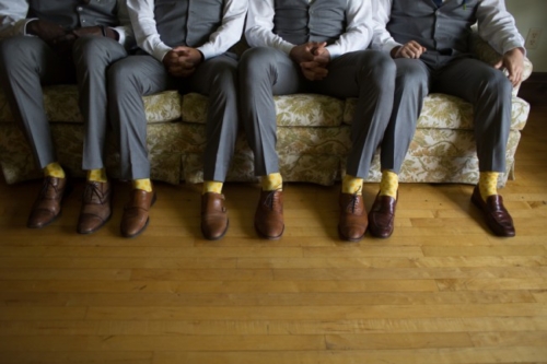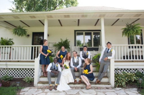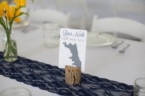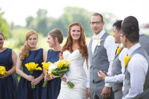 Photographer’s Remarks “Taking place at the always inspiring Heritage Prairie Farm, this unique wedding of blues and yellows featured calla lilies and phaleanopsis, and even a serenade by Kieth Semple from season 9 of The Voice. “All the beautiful details and special touches took back seat to the main event of the day which was Colette and her amazing movie star looks and blazing red hair. I think she must be related to Julianne Moore somehow. Look at her bridal portraits and you’ll see what I mean. The reception was decorated with so many whimsical touches. “The simple yet very decadent wedding cake was a special gift from their Aunt Lou, who continued the family tradition and supplied the homemade peanut butter delicacy. Their talented musician friend, Kieth Semple, showed up to play an amazing first dance song called ‘Take Me Home’. Lee Michaels took over later to get the party going on the dance floor. “My favorite moment? They skipped down the aisle after their kiss.” “The guys went bold with lilies on the lapel and yellow bow ties with yellow matching socks.” “One of my personal favorite details was the custom invite designed by Jinaiji and printed by Zazzle. It was such a personal touch to the day and really set the tone for their guests” “Colette wore a satin gown by Allure Bridal and all her girls wore bright blue dresses with a unique triangle cutout.” “The tables were set with a variety of vintage farm plates and guests were able to find their tables named after popular Chicago neighborhoods. “The sweetheart table was named after the South Loop because that is the neighborhood where Colette and Andrew met. Also, the table layout was designed so the southernmost neighborhoods started at the sweetheart table and then each table matched their true locations as you head north in the city with the most northern neighborhood ending at the DJ booth.” “Jars filled with sliced lemons were scattered throughout the party and all the guests went home with a special gifted jar of honey from the farm. The sweets table was courtesy of the famous Stans Doughnuts in Chicago, Illinois.”
