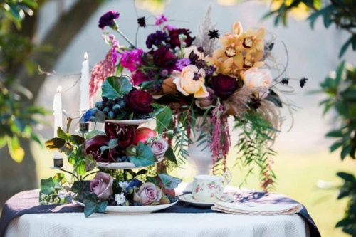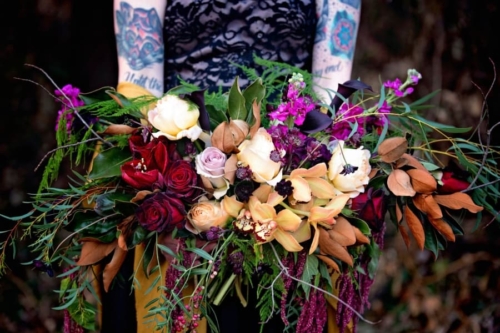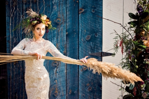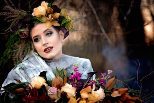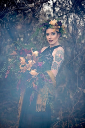 A dark and moody look incorporating dark jewel tones with ivory and black. Lush, dripping florals mixing fresh flowers with dried material and bare branches celebrate the coming winter and symbolize the faint glow of life contained within hibernating winter life forms. Our bride is alone, perhaps jilted at the alter or having lost her lover to death.
