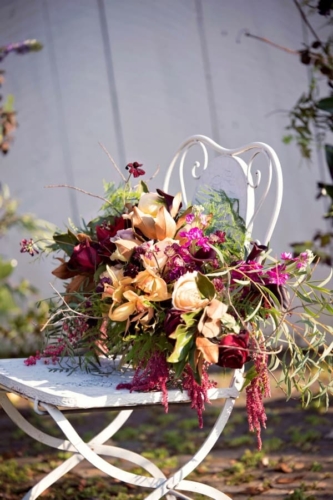 We used florals in our tea party, wedding alter set up and in our unique custom made bridal headpiece. The florist selected dark orange orchids, dark red roses, mustard roses, plum ranunculus, eggplant calla lilies, burgundy scabiosa and/or chocolate cosmos, dark red hanging amarathus.