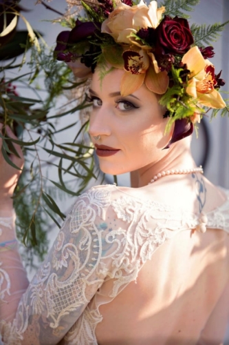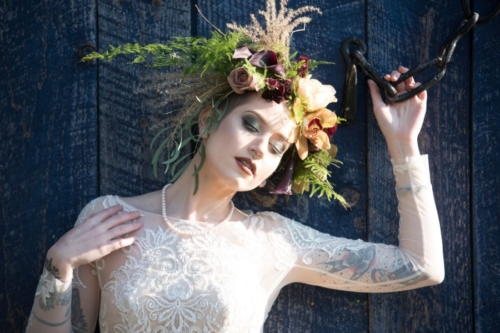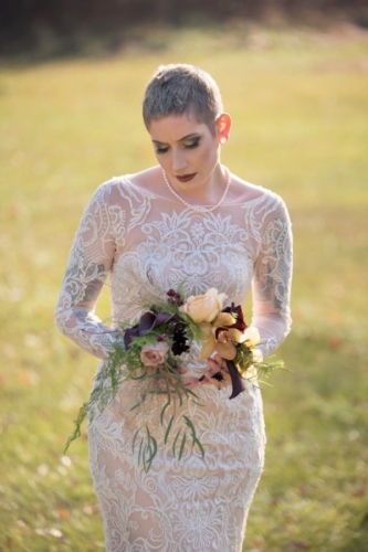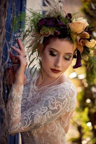 Our bride model, recently shaved her head down to a buzz cut. Our florist designed a custom floral enhanced headpiece to accentuate the shape of her face and bring out the hue in her eyes. Our bride was feeling a little less than beautiful with her new haircut, but I believe it added to the theme of being non-traditional.