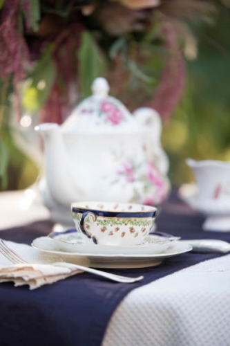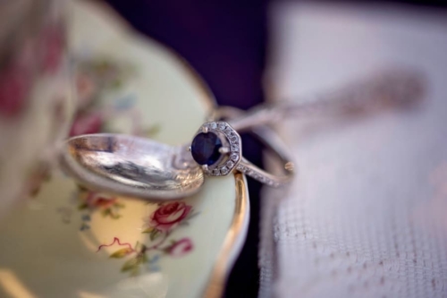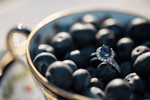 Our tablescape, was set up for a tea party, and you’ll see our traditional vintage tea set and a selection of jarred tea leaves. We relied on the seasonal and unique wintery fruits to add a pop of color and set the tone for the detailed ring shots and to bring a moody vibrance to our theme.