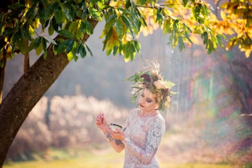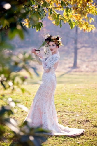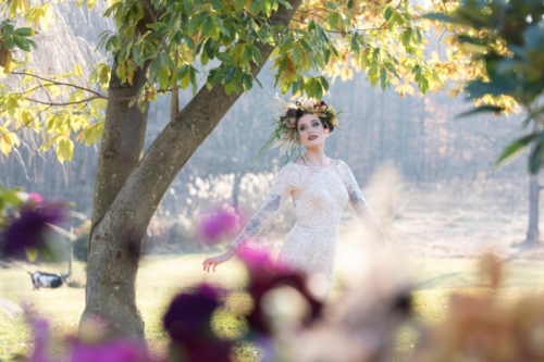 We used several elements as you’ll see; first our bride is having a solitary tea party as she preps and mediates on her upcoming nuptials. Next she visits the alter and waits. As she looks for her lover she wanders into the woodlands where she grows tearful. She experiences a range of emotion and expresses the loss and courage in these images as she comes through the fog and into the light.