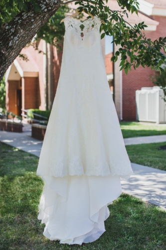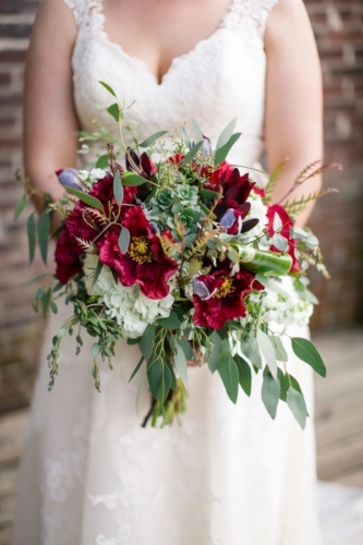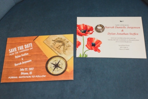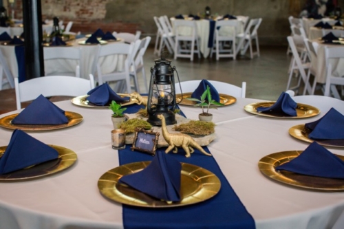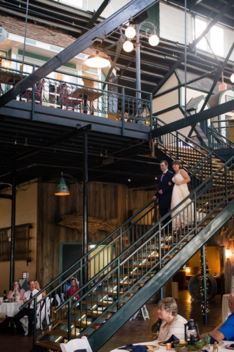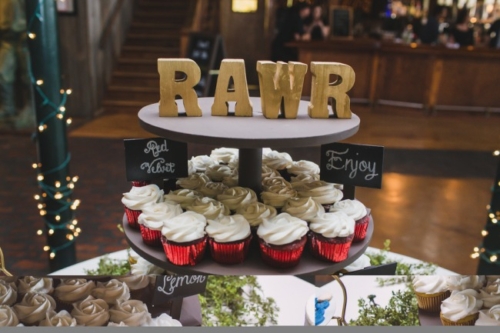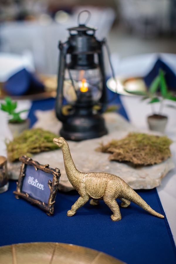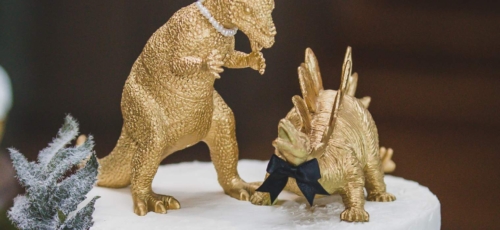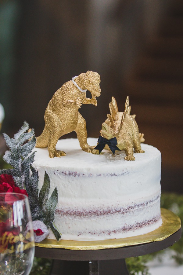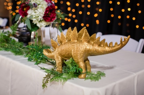 Photographer’s Remarks: “While some girls grow up envisioning their wedding, Darrah grew up envisioning a career in paleontology. Thus it was perfectly fitting — once she fulfilled that career goal and found a fellow scientist with whom to spend her life — that the day they tied the knot would come with plenty of dinosaur details! “Among these were the plush dinosaur their flower girl carried down the aisle and the many DIY dinosaur centerpieces at their reception (which were Dollar Store finds they spray-painted gold), as well as a DIY photo booth featuring dinosaur and paleontology details. “The bride and groom even did a dance with their bridal party to the song I Am a Paleontologist by They Might Be Giants — leaving no question for any of the guests as to what the day’s theme was! “And even items that didn’t fit that theme so overtly still had subtle tie-ins. Case in point: The bride’s massive, brightly colored bouquet, which she described as ‘clurassic’ — a cross between classic and Jurassic.”Gallery