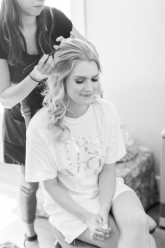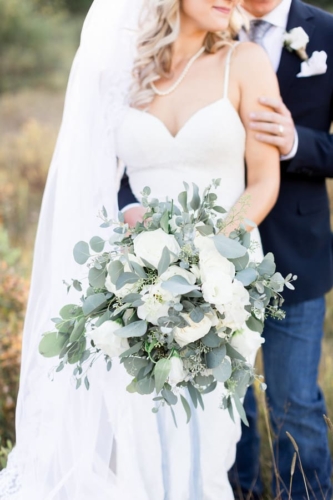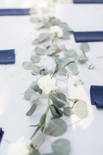 “I used minimal flowers. For my bouquet, I wanted a ton of white flowers. From white roses, lisianthus, to white carnations, I wanted my bouquet to explode! For the girls, there were a few white flowers with a ton of greenery. I loved how simple they looked against their grey and navy dresses. For the tables, there were two types of eucalyptus and white carnations. Without these touches, It would have been TOO simple!”