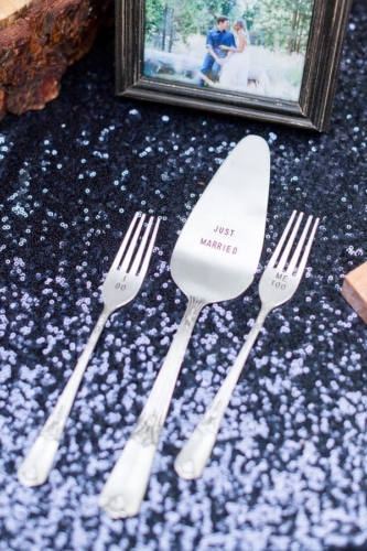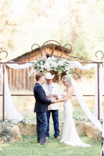 “We got married on a family ranch, called The Circle 7 ranch, so instead of building an arch, we used their really old ranch sign, added some hay bales underneath, put some greenery on the top, and called it good! There was history, and love put into that. My husband also made our ‘Welcome book’ which was a piece of wood slab that we are going to place behind our couch in our next home.”
