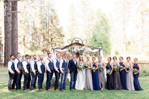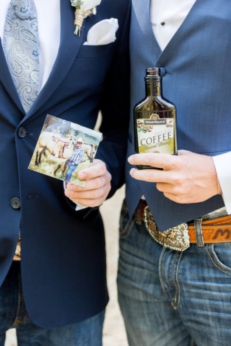 “Navy and Grey are my absolute favorite colors. I wear them daily, and I think they give off a simple, farm house feel. Also, the girls looked incredible in them! They had the opportunity to choose their own style, and their favorite shade in the navy and grey color scheme. It looked AMAZING. For the guys, I went with a simple white shirt and navy vest and jeans. David wore a fabulous Zenga jacket with an awesome blue and grey paisley tie. On the bottom he wore a pair of silver label Cinch Jeans and his favorite cowboy boots! So handsome!”