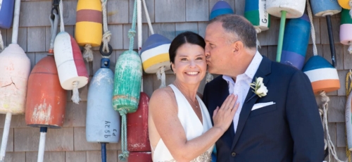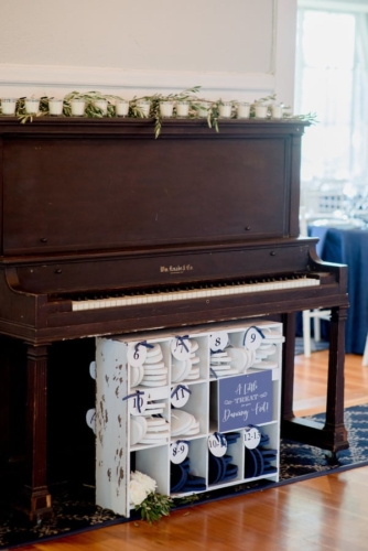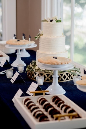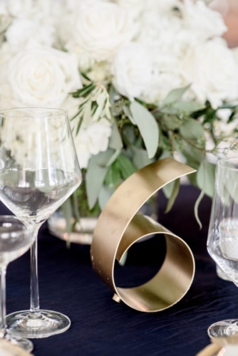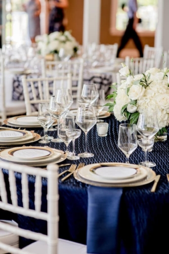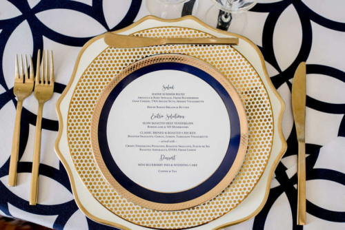 Bob and Denise are opposites in many ways, but their differences in personality and style collided in a beautiful wedding at York Golf and Tennis Club. With a floral chandelier from York Flower Shop, catering (including a raw bar) from the White Apron, and stationary Impress Me Designs, the ceremony and reception included the bride’s detail-oriented and the groom’s big-picture sensibilities. The wedding was urban and refined but whimsical at the same time, combining Italian and Irish backgrounds with New England aesthetics. Peak Event Services provided the rentals which were incorporated into two different table designs, both of which used blue and gold as a point of inspiration.Gallery