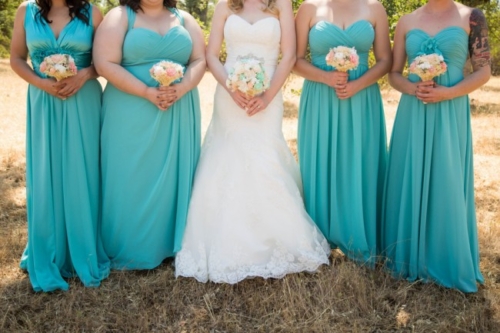 Different style bridesmaid dresses in a stunning coral blue color. If you’re looking to buy bridesmaid dresses online at Dessy, look at either ‘Coastal’ or ‘Spa’ for a similar matching color. Dessy does have a good selection of plus size dresses as well.