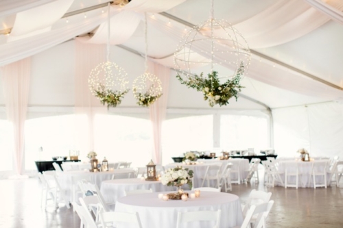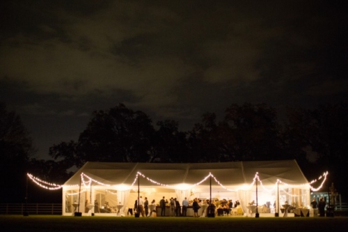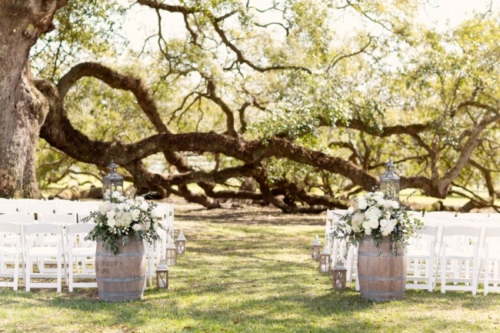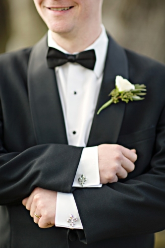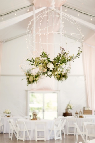 “I loved the bride’s bouquet with the silver handle that included a small cross from her grandmother, as well as the sixpence she wore in her dress. She found beautiful fleur de lis cufflinks to give to her groom and he found a vintage lighter for her gift. They chose spherical iron chandeliers that the florist draped in flowers and hung from the tent tops. The couple’s love of wine was displayed with vintage wine barrels as part of the decor around the property.