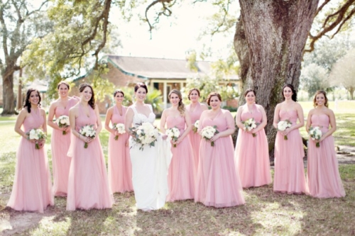 There are a lot of really well done elegant-meets-rustic elements in today’s wedding. We love the crisp white look of the reception area, with punches of greenery and rustic decor. Don’t get us started on the bridal party attire — pretty in pink to say the least!