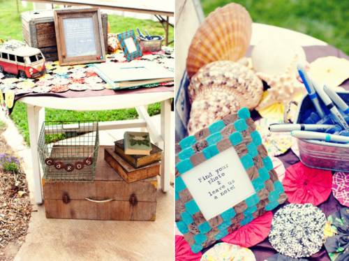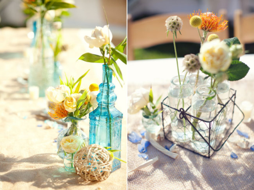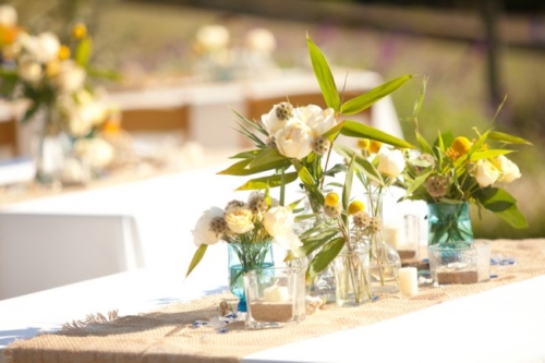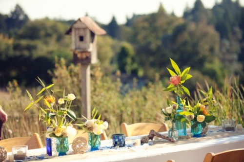 The outdoor reception looks perfectly whimsical and DIY! Flower vases and old jars mixed with wild flowers.