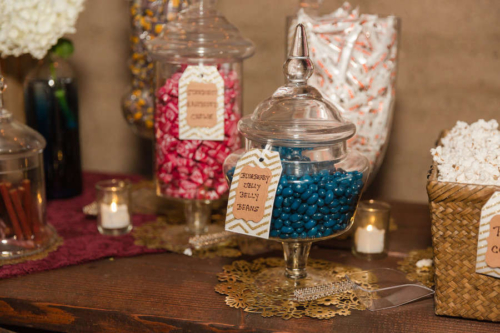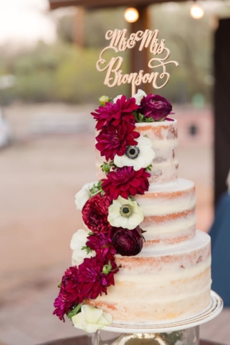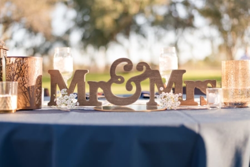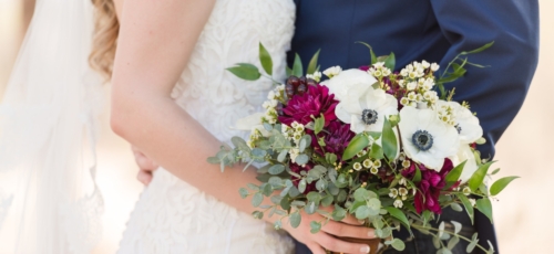Q: Tell us about your wedding! “Our wedding was Rustic Chic. We really wanted a backyard wedding feel and take advantage of Tucson’s Spring weather. Our theme was Tying the Knot. From our Save the Dates through the wedding we kept the theme alive. We wanted to have a rustic feel for our wedding, but classy at the same time. The main colors were a bright navy and burgundy with brown and gold accents. We had a traditional Christian ceremony, covenant marriage, but since Tying the Knot was part of our theme we actually tied a knot as our unity ceremony. My husband also has a son so we incorporated a Family Branding on our wood wedding arch, that my husband built!” Q: Let’s talk wedding decor “I would say a lot of our decor was DIY. Our centerpieces were accumulated wine, beer, and liquor bottles that we spray painted gold for single stems to be place in. We also had trees with hanging mason jars spread out throughout our reception guest tables. Wood decor was very popular for us. Fruitwood chairs for both ceremony and reception. Our ceremony had 1st Corinthians plaques and mason jars down the aisles. My husband built our wood arch, and my mom made a Beautiful silk arrangement to hang at the top that matched the floral colors.” Q: What were the florals like in your wedding? “Floral did play an important role in our wedding. The flowers gave us the beautiful burgundy pop that we wanted. The bouquets had ranunculus, Anemone, dahlias. The centerpieces had the same with single stem gerber daises and hydrangeas. The boutonnieres were burgundy and white ranunculus flowers, and corsages were gold cuffs with burgundy ranunculus for the moms.” Q: Did you personalize the day in any way? “Since we wanted a backyard feel for our wedding we did incorporate lounge areas and lawn games to keep guest entertained, as well as a bluegrass band, photo booth, and Sweet & Savor Bar for them to take goodies home. “We LOVE Mexican food, Carne Asada especially, so we wanted to make sure that we incorporated fresh authentic Mexican food for our Menu, and a specialty margarita to compliment. Our hashtag is #bronsonbliss so we called our margarita the MargaritaBliss. Our favorite personalized touch was our gelato cart from Frost. Our guests are still talking about it, and how they loved the combo of cake AND ice cream.” Q: Let’s talk fashion “I wanted lace, fit and flare, and something that would compliment my wedding boots. This dress did all that. The back of the dress was a low cut frame, and showed embroidered detail on the sides. I knew I didn’t want a ball gown, but the fit and flare gave it just the right about of poof to make it feel very bridal. I had 11 bridesmaids and different shapes and sizes, and 3 pregnant. So, I needed a dress that would compliment them all. “We chose the wrap dress so the ladies were coordinated at the bottom, but they could wrap whatever style of top they wanted and feel comfortable in it. They were a brighter navy which gave them a beautiful pop of color and looked good on all of them. As well as, working well with their boots. “The men’s attire was a little more challenging. My husband loves a good pair of nice jeans so we pieced multiple items together to get the look we loved. Finding the bright navy jacket to match the ladies was hard, but once we found the jackets, we complimented them with Ivory shirt, brown vest, and burgundy paisley tie. The groom had an ivory paisley tie to stand out.” Q: How did you meet? “Luke and Dominique first met through Luke’s younger sister, Emily, in 1999! Fast forward a bit to 2002 where Luke and Dominique reunited in High School at Sahauro. Luke was a senior and Dominique was a freshman. They were just friends with a ritual meeting after 2nd period, almost everyday. Luke graduated and went into the military, and Dominique continued on in school. It wasn’t until 2011 after Luke got out of the military, he contacted Dominique through Facebook. After occasional casual catching up, Luke took Dominique on their first date in the fall of 2011. Funny how life works…5 years later! They got engaged, on Christmas Eve 2016. Luke proposed on Mt. Lemmon, making it incredibly romantic and intimate, AND still managed to photograph their special moment on a timed tripod. BEST CHRISTMAS GIFT EVER!” Q: What was the most anticipated or special moment of your wedding day? “Our First Look! We wanted the first look for a couple reasons. First, to spend more time with each other on our wedding day. Second, to have those special photographed moments together, with our bridal party, and our families. I also, had a bet with Luke’s sister to see if my husband would cry when we first saw each other… AND HE DID! It was a magical moment.” Q: Do you have any advice to share with other couples planning their day? “Biggest thing I can recommend is try and space things out. Wedding planning can become very overwhelming so to keep the excitement, spread out tasks so each thing is special. “Also, know your groom! Discuss in the begging of planning how much or little he would like to be involved on decision making. Understand what his priorities are to make those a big deal, because lets face it, everything is priorities to a bride. In our experience, this will make your wedding planning experience go smoothly.”Gallery