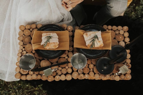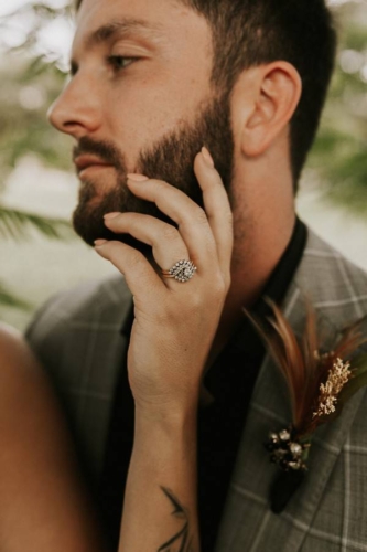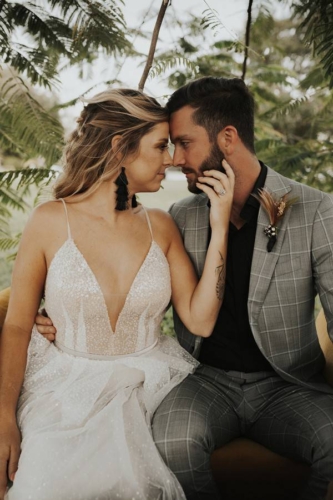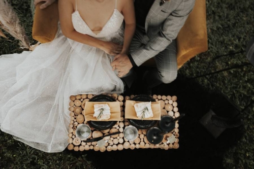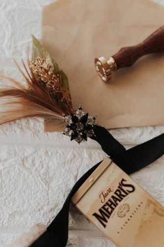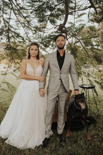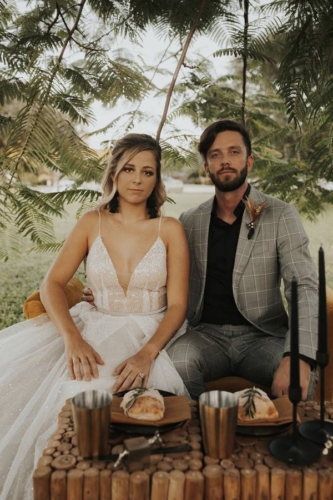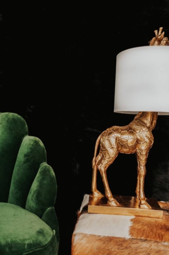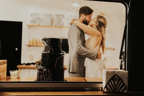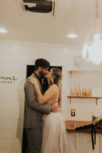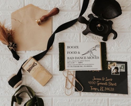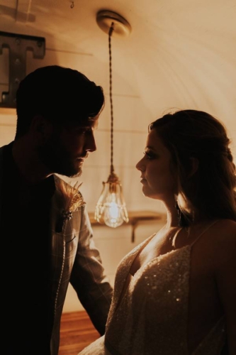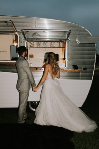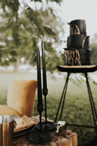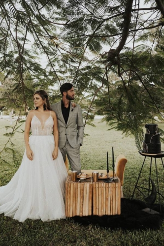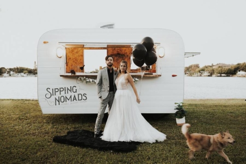 Photographer’s Comments: “This one’s for the laid-back, edgy, non-traditional brides! We wanted to create something totally different with a mysterious “series of unfortunate events” vibes. When going around a local vintage shop we found this eclectic golden giraffe lamp and everything came together. We had a bar caravan, ice cream caravan, beer, and a Doberman and so much more, but this smoking hot couple is truly what tied our vision together! The team of vendors are all so talented and it was truly an honor to work with them, enjoy this rad wedding inspiration!”Gallery
