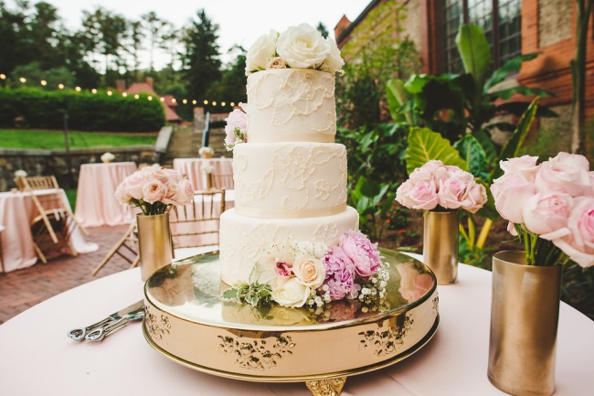 Quite the hefty gold cake platter to support an equally divine wedding cake!