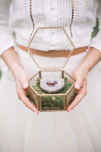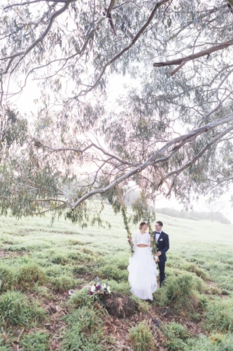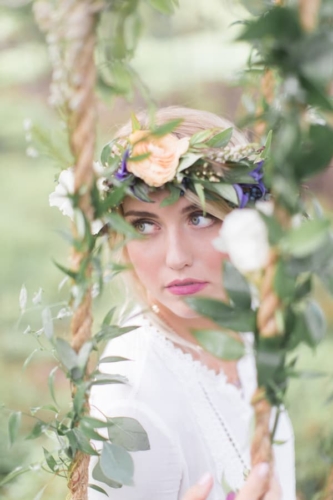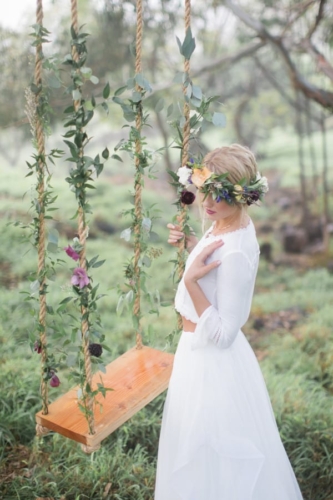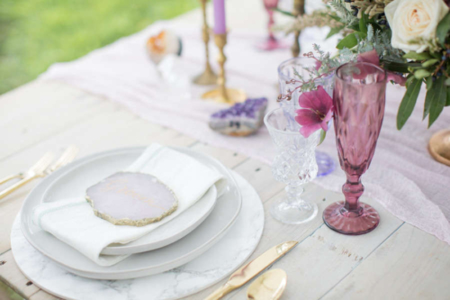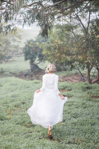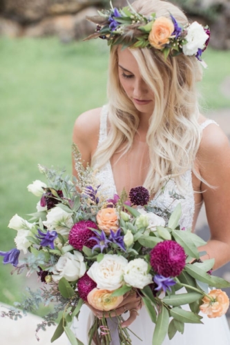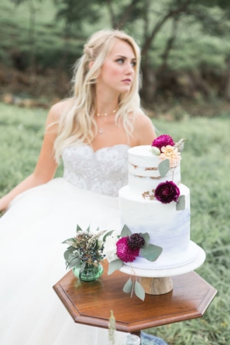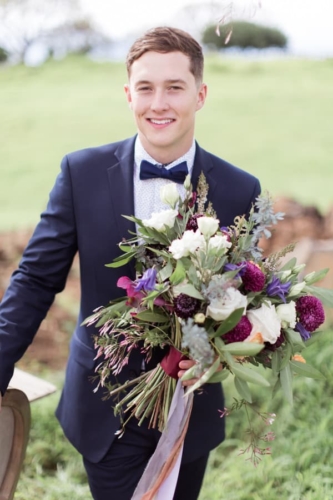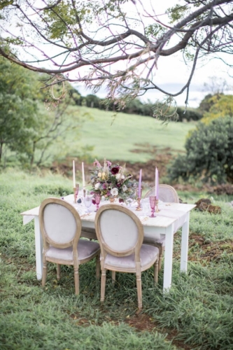 Photographer’s Comments: “Rolling green fields, misty clouds and stunning views of the Pacific encompass the beauty of Maui’s upcountry. Teaming up with Maui’s talented vendors, we chose a new private wedding venue in Keokea. Above Wailea, it is the ultimate setting for a next level private escape on Maui. “The inspiration came from the natural landscape and culture on Maui. Jacaranda trees in bloom and Maui’s bohemian vibe helped us choose the style and look to celebrate this beautiful place. Showcasing an alternative to palm trees and gorgeous beaches, we were inspired by the slow lifestyle and country chic that embodies upcountry Maui. With a view over Wailea and with neighbors like Oprah, this location has it all. “Hailey and Sam, our cute couple for the shoot, actually had never met before, even though Maui is a small town kind of place. Hailey greeted Sam, with “Hello Husband!”, and Sam of course replied with “Hello Wife!” They instantly warmed to each other as we began shooting and continued to chat. Lots of giggles ensued, and our team was full of smiles at the thought of being unintentional match makers. “Dusty purple hues and light cream blushes enhanced the setting at Keokea Ranch Estate. Bella Bloom created the amazing florals for our sweet couple and took inspiration from a wild flower perspective. A hexagon vintage cake table and a trunk from the 1940’s decorated our lounge area. “Crystals and stones were another influence as amethyst and citrine embody calm and relaxation as does the upcountry landscape. Taurus Moon by Nicole Martyn was our local Maui jewelry designer who adorned our lovely bride with gold and crystals as well. I was thrilled to be able to hand pick the dresses in CA while visiting friends. “I got to play bride and relive the experience. My advice to brides is to try on at least a few choice gowns, not just the first one you fall in love with. This is a once in a lifetime experience so have fun with it! “The breezy afternoon brought some light mist giving the end of our shoot a magical glow. Our couple left the shoot and let everyone know they were off to a mutual friend’s cocktail party together. Maybe one day with luck, they will come full circle, fall in love and get married…. again.”Gallery