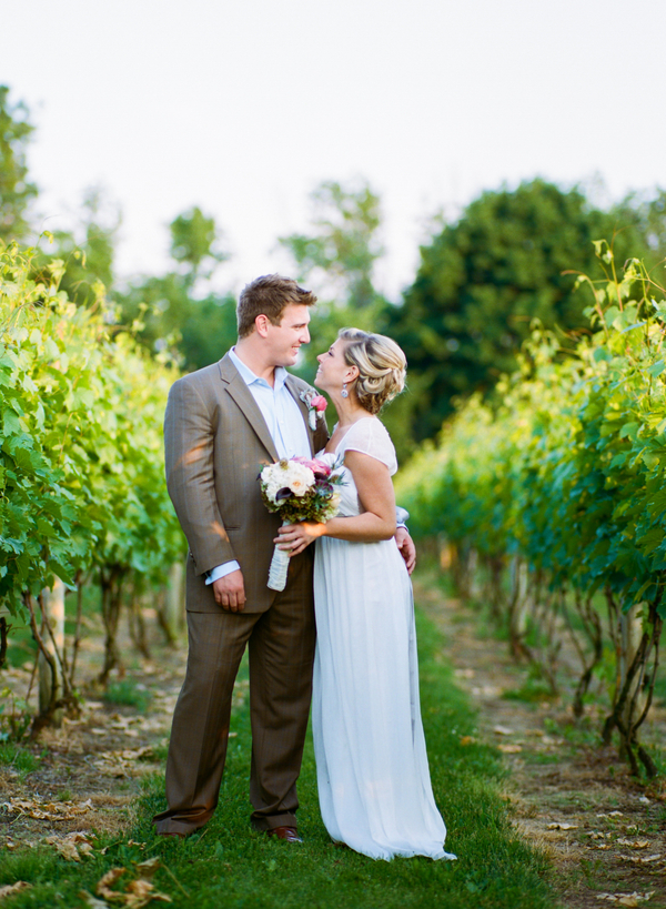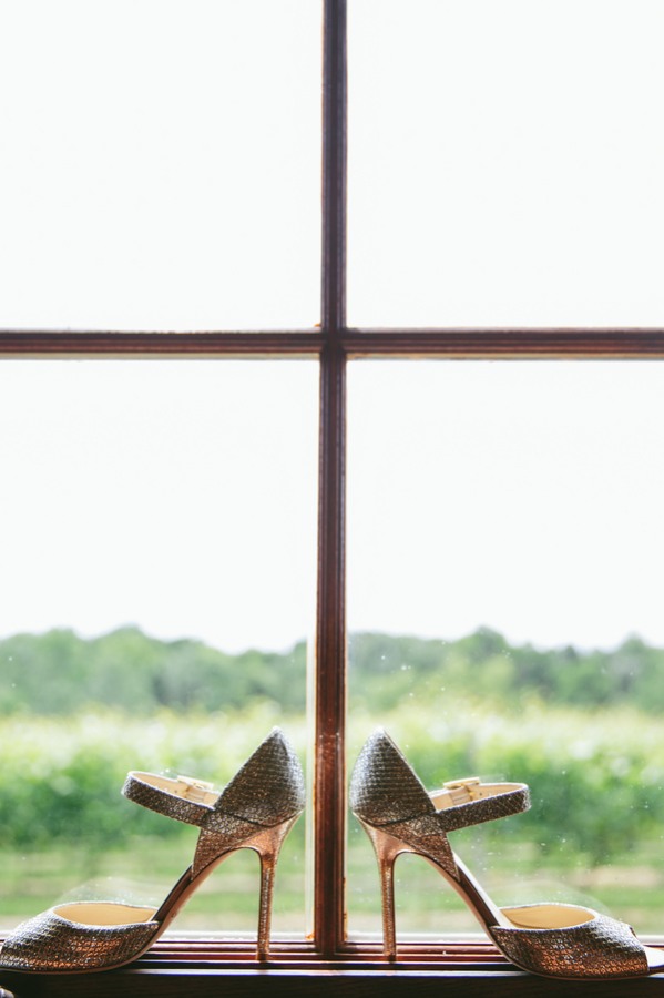 “This inspiration shoot took place in the cute little lake town of Cazenovia, New York at 2 different venues, one historic and the other brand new. The Lincklaen House is in the center of the town and Owera Vineyards is Cazenovia’s only vineyard sitting atop a hill overlooking the town and lake. Our couple, Dave and Ashley, are a real couple who are totally in love and actually considered having a justice of the peace marry them at the shoot! We had two different bridal looks and the fabulous Jimmy Choo shoes completely both looks perfectly.”