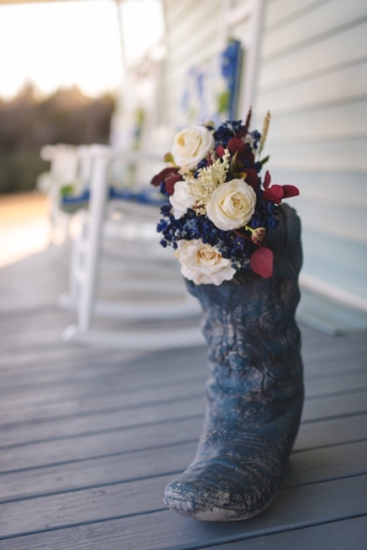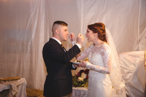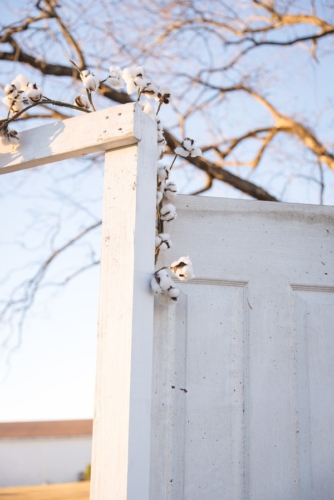 “Elizabeth wore a beautiful long-sleeve lace Melissa Sweet gown and Dalton looked so handsome in his Army Blues. The guests snuggled up on bales of hay as the wedding party entered through a beautiful white door with cotton accent.”