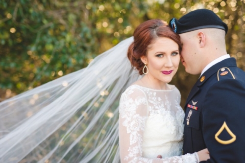 Okay, Harry Potter hasn’t left wizard school for the army. I realized after hitting publish that the title of today’s feature wedding may suggest that! Loving the groom in uniform along with the bride’s dress/veil combination.