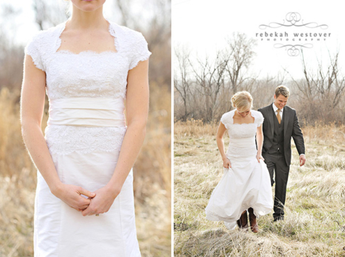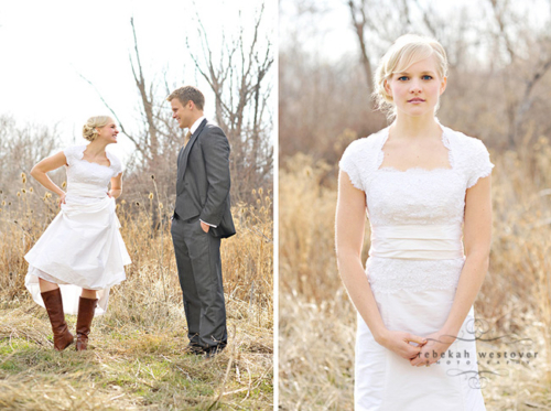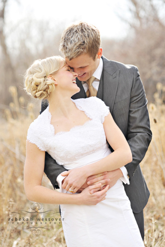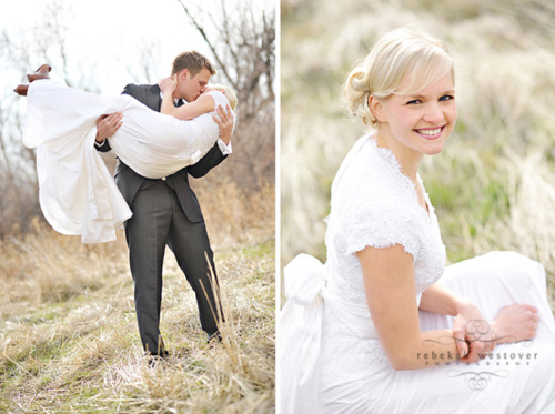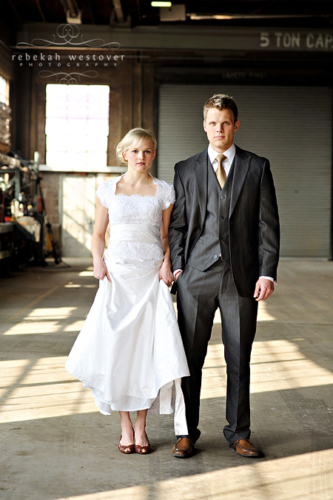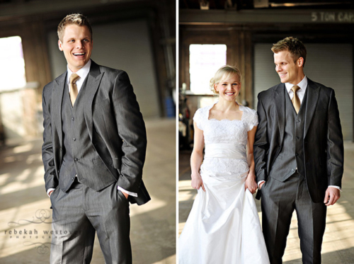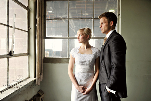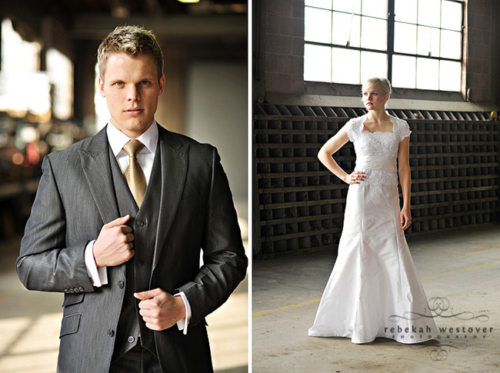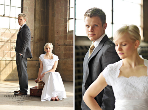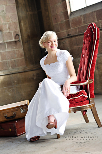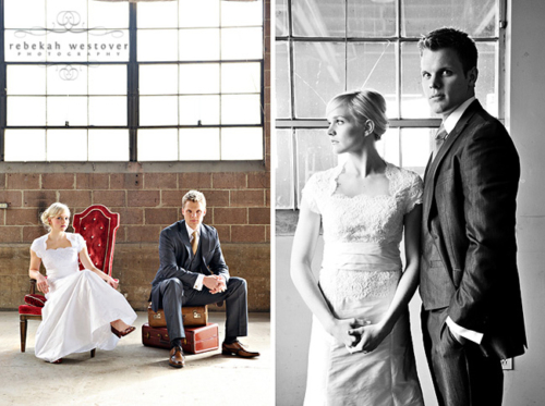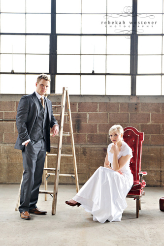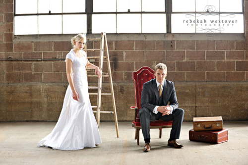 This is the first time we’ve seen a pre-wedding shoot with both the bride and groom in their wedding clothes, and we gotta say, we LOVE it! Rebekah Westover, the talented photographer, said “it’s SO hard shooting in the winter in my opinion. But this year I’ve decided to embrace the deadness and stop trying to fight it!!” The result is beautiful. Jeff’s suit is super sharp and Emilee looks gorgeous in her dress, which was custom made of raw silk and patched together lace! The props they used are amazing–the vintage suitcases, the ladder, but especially the red chair! Rebekah told us that Emilee’s dress got a little dirty during the shoot. When Rebekah started getting anxious about it, Emilee was like “Oh, I’m so over it. I’m only going to wear it once more in my life.” Now THAT is one cool and laid-back bride! Emilee and Jeff are so photogenic and so obviously in love with each other! Make sure you head over to Rebekah’s blog to see more of their session.Gallery