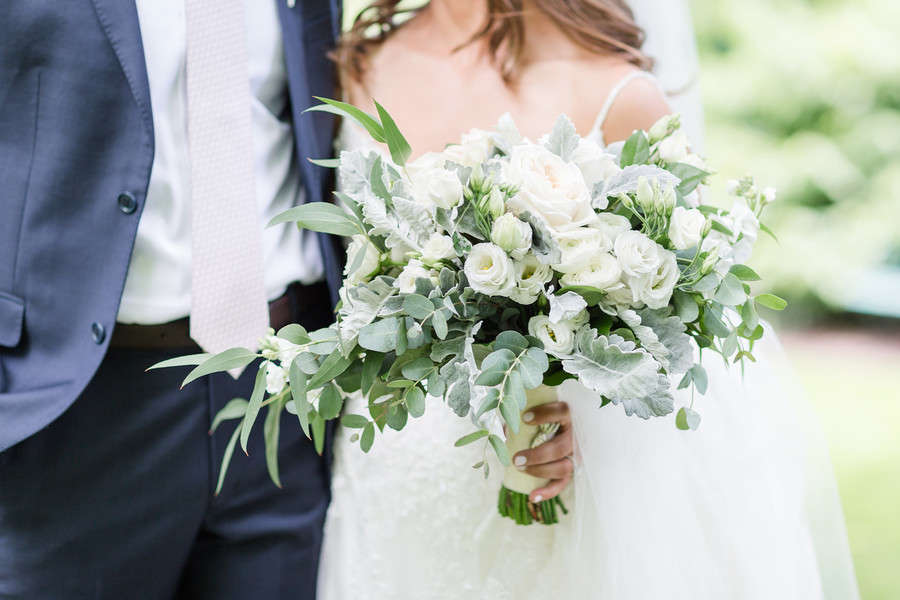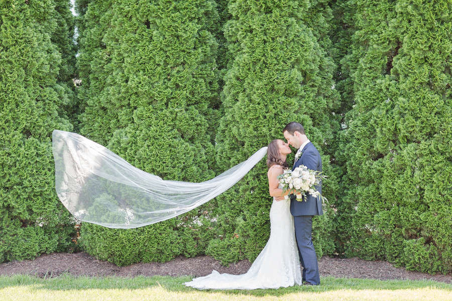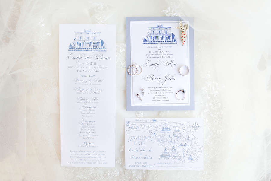 Photographer’s Comments: “It was a gorgeous summer day on the afternoon that Emily and Brian tied the knot in the beautiful gardens of The Anrtim 1844. All of the white and green floral details went perfectly with their soft and romantic palette. Emily’s bridesmaids hadn’t seen her in her dress so that was a fun surprise! Brian and Emily then shared a sweet First Look under a tree with green vines wrapped around it. It was the perfect setting! “After portraits and bridal party pictures, Emily and her dad shared a tearful First Look as well. It was so precious to watch them share in such a sweet memory together! Brian and Emily said, “I do” with their friends and family surrounding them on the warm afternoon day. Then they danced the night away and celebrated the beginning of their new chapter as husband and wife! The two of them also wanted to take golden hour portraits and they turned out beautifully. I love when my couples give me lots of time for portraits so they have several options after their big day! It was an amazing wedding. “Here is a little bit of their love story! “Brian and I both worked at Hunt Valley Golf Club during the summer in between our sophomore and junior year of college. I was a lifeguard and he was a snack bar boy! We became fast friends and kept in touch over the fall following that summer. (He was at UD and I had just transferred to Towson) I told my mom during that summer he was the one and the rest is history! “And the proposal: “What a fun story. I have been anxiously awaiting the proposal for quite some time. Brian knew he needed to be sneaky because I am a huge snoop! Brian planned a surprise for me at my elementary school and popped the question in my principal’s office! Our families were in the conference room! It was so thoughtful and sweet. Sharing the news with my second graders after we celebrated with our families was an amazing memory!”Gallery