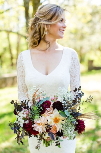 A3: Using locally and ethically grown flowers were important to us. we chose bees wing farm in Virginia. the bride knew she wanted dahlias and greenery but nothing too elaborate or stuffy looking. we wanted a natural, homegrown, beautiful color, classy vibe. the florist met with us over the phone and in-person and really delivered! We had wristlets for the sisters and mothers and boutonnieres for the dads and brothers and groom. the bridal bouquet was the stuff dreams are made of and the flowers all photographed so well we got so many compliments. again, our coordinator took the lose stems and buds and arranged them all for us at the ceremony and reception site to make it all beautiful.