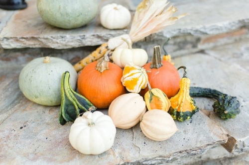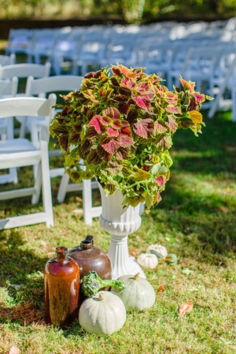 Color palette: we wanted a sense of romance and outdoors, we knew we wanted the fall with changing colors of the season. once the groom chose his amazing burgundy suit we had that to play off so we asked our sisters to wear blush and our brothers to wear navy or grey. We didn’t want anything artificially colored so we used flowers in season and pumpkins in season to complement the color scheme of burgundy, blush, ivory, green, and orange.