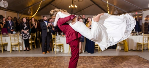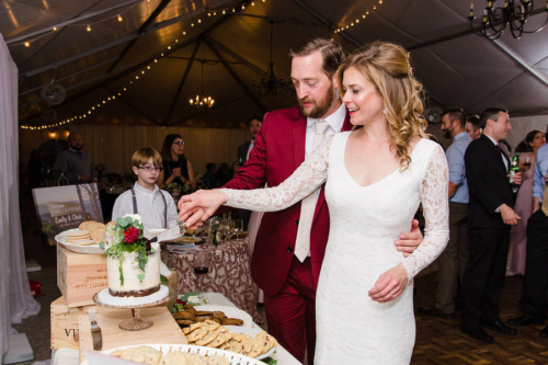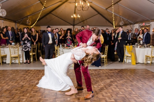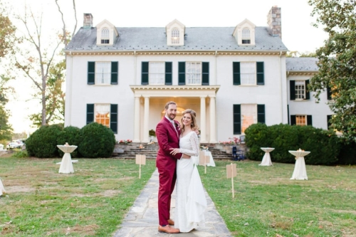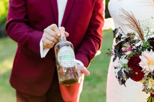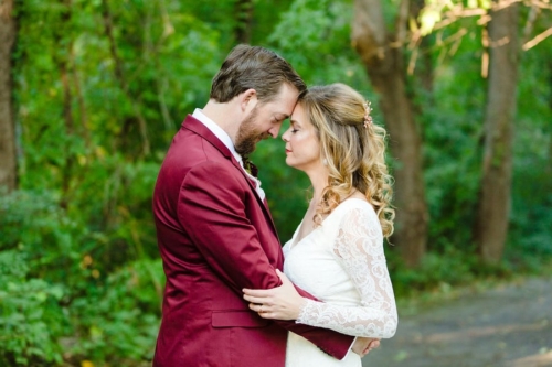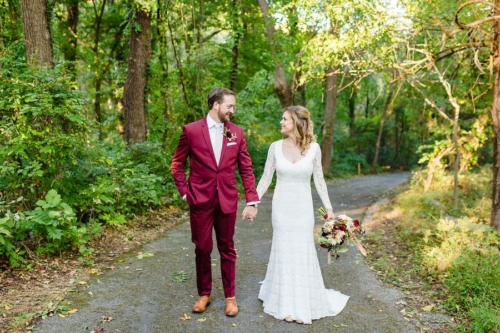 A5: As someone that wears a navy suit regularly, Chris wanted something that would stand out from the typical navy, grey, or black formal wear worn by most grooms and set off to find a color that would tastefully stand out. At first, Chris looked into a forest green suit but we both worried that it would inadvertently blend into the outdoor venue filled with trees and bushes. Since the wedding was taking place in the fall, Chris found a burgundy suit that really captured the fall colors we hoped to incorporate into the wedding itself. When Chris showed Emily the suit online, she was immediately smitten and it ended up helping set the rest of the color palette for the wedding itself.