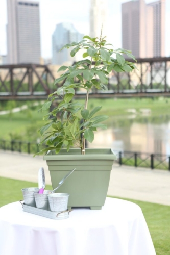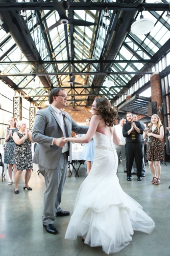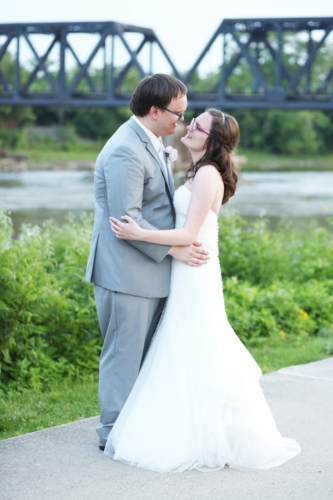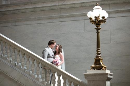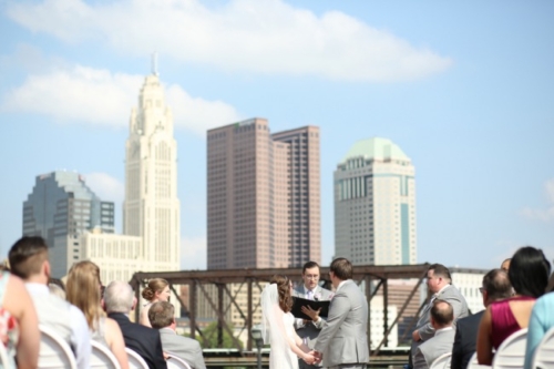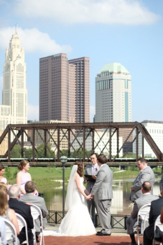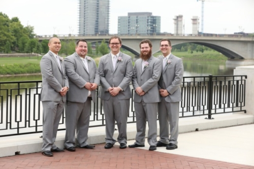 Photographer’s Remarks “As soon as I arrived at Emily’s hotel room at the DoubleTree in downtown Columbus, Ohio I knew the day would be full of nothing buy joy. She was radiant! “After the girls and the guys were all ready, we walked over to the Ohio Statehouse for their first look. We set up the first look so Chris could watch Emily coming down those pretty stone stairs- like straight out of a Disney princess movie! “Chris and Emily had dated for several years, but he looked at her like he had never seen anything so beautiful before in that moment. After portraits at the Ohio Statehouse, it was time to head to North Bank Park for the ceremony. It was a hot spring day, but it was so beautiful- Emily and Chris were married beneath the skyline. They chose a buckeye tree to plant at their new home and placed soil around it from both of the houses they grew up in. “We almost didn’t make it out for sunset portraits because everyone was having such a blast at the reception! The dancing continued through the night as everyone celebrated the happy couple!”Gallery